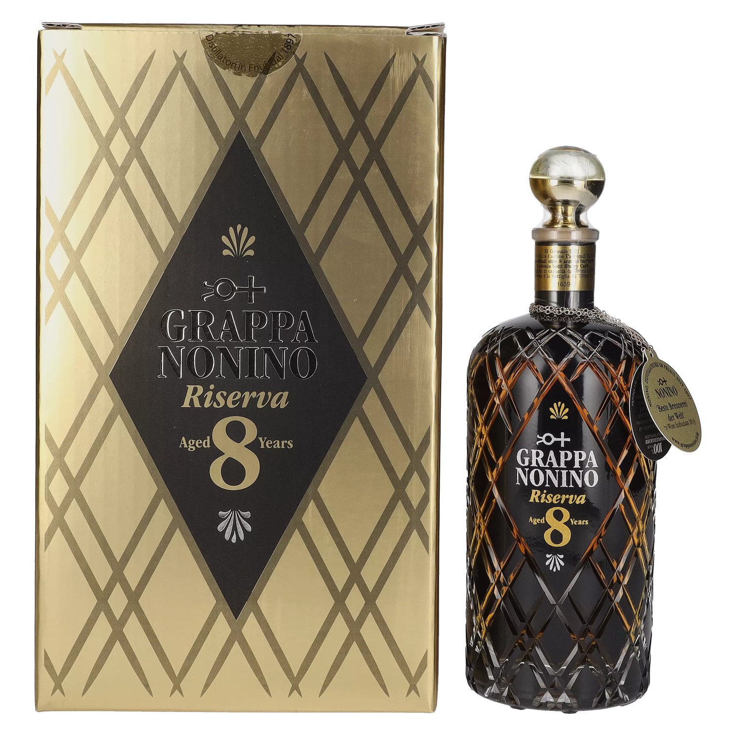 Der Nonino Grappa Riserva 8 Years Old reifte acht Jahre und wird aus Trauben von Monovitigno, Moscato, Friulano, Merlot und Schioppettino hergestellt. Die Destillation erfolgt in Kupfer-Dampfbrennkolben, gefolgt von einer achtjährigen Lagerung in Barrique-Fässern. Doch nicht nur der Inhalt beeindruckt, auch das Flaschendesign ist ein wahrer Blickfang. Die kunstvoll gestaltete Flasche besteht aus geschliffenem schwarzem Glas, das mit einer Diamantscheibe bearbeitet wurde. Ein Silberkettchen ziert den Flaschenhals.