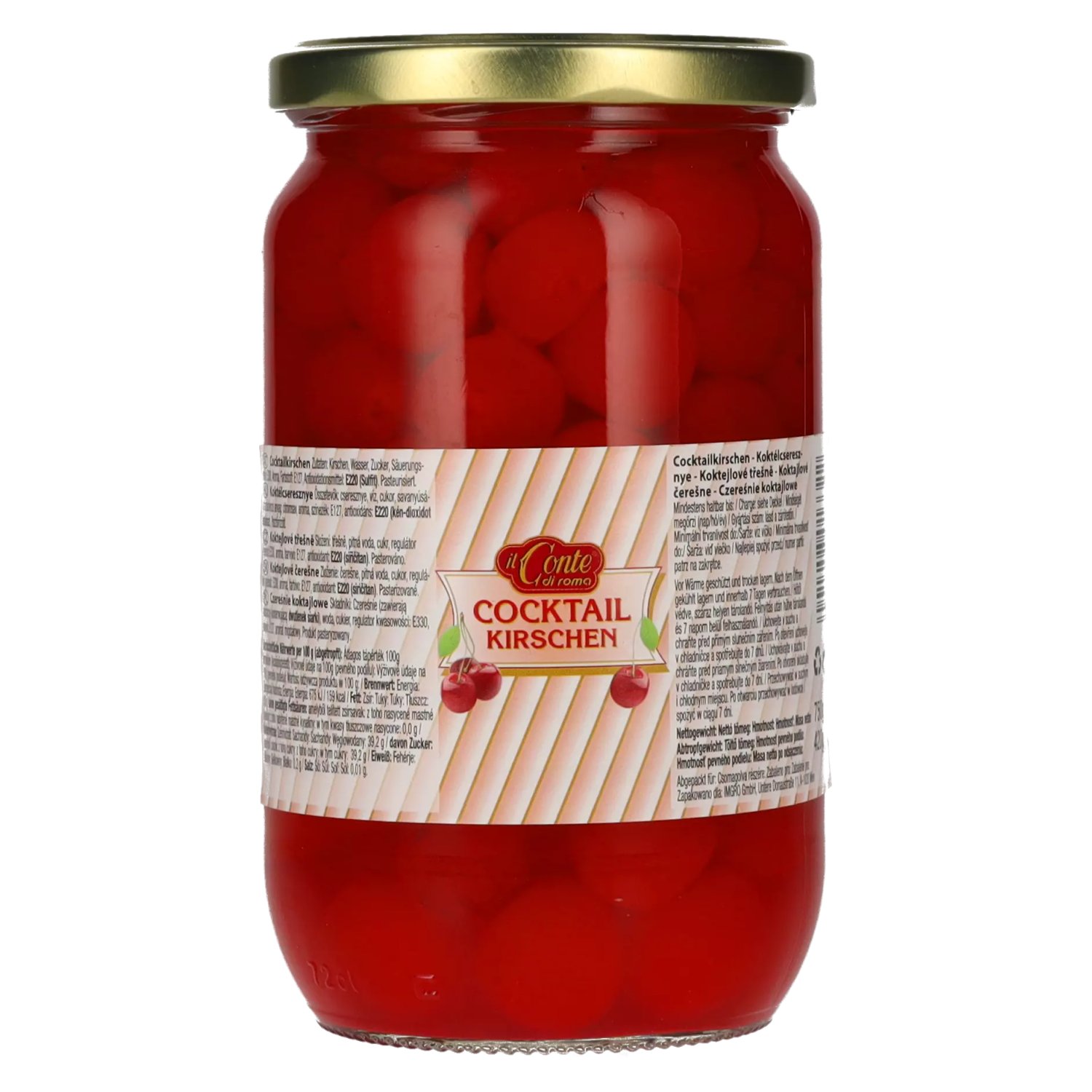 Marke: Zutaten:Kirschen, Zucker, Wasser, Säuerungsmittel: Citronensäure, Farbstoff: E127, Aroma, Antioxidationsmittel: E220 (Sulfit). Pasteurisiert.
