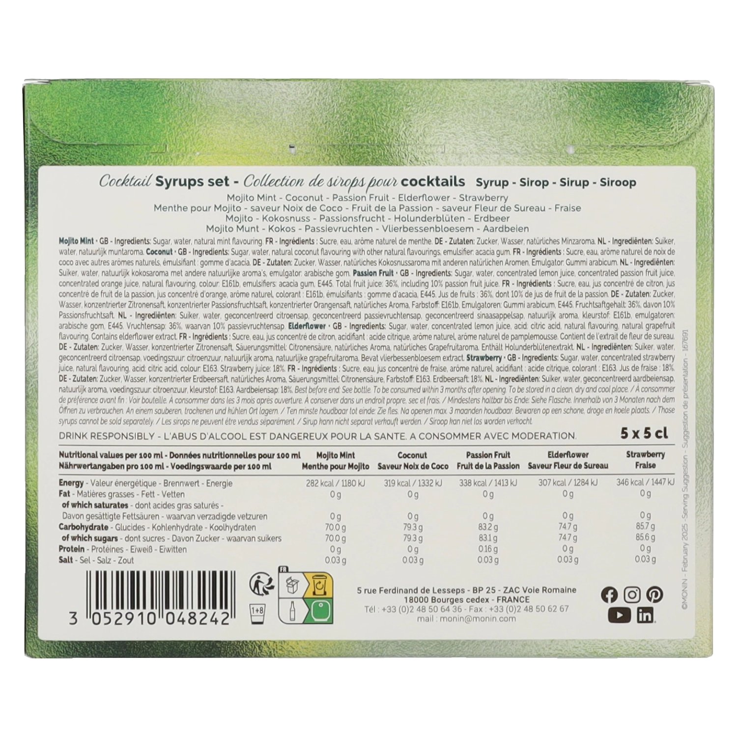 Zutaten:Fruit de la Pasion: Zucker, Wasser, konzentrierter Zitronensaft, konzentrierter Passionsfruchtsaft, konzentrierter Orangensaft, Farbstoff: E161b, natürliches Aroma, Emulgatoren: Gummi arabicum, E445. Fruchtsaftgehalt: 36%, davon 10% Passionsfruchtsaft. Mojito Mint: Zucker, Wasser, natürliches Minzaroma. Fraise: Zucker, Wasser, konzentrierter Erdbeersaft 1,5%, natürliches Aroma, Säuerungsmittel: Citronensäure, Farbstoff: Anthocyane, Cochenillerot A. *Entspricht 18% Erdbeersaft im Endprodukt. Coconut: Zucker, Wasser, natürliches Kokosnussaroma mit anderen natürlichen Aromen, Emulgator: Gummi arabicum. Elderflower: Zucker, Wasser, konzentrierter Zitronensaft, Säuerungsmittel: Citronensäure, natürliches Aroma, natürliches Grapefruitaroma. Enthält Holunderblütenextrakt.