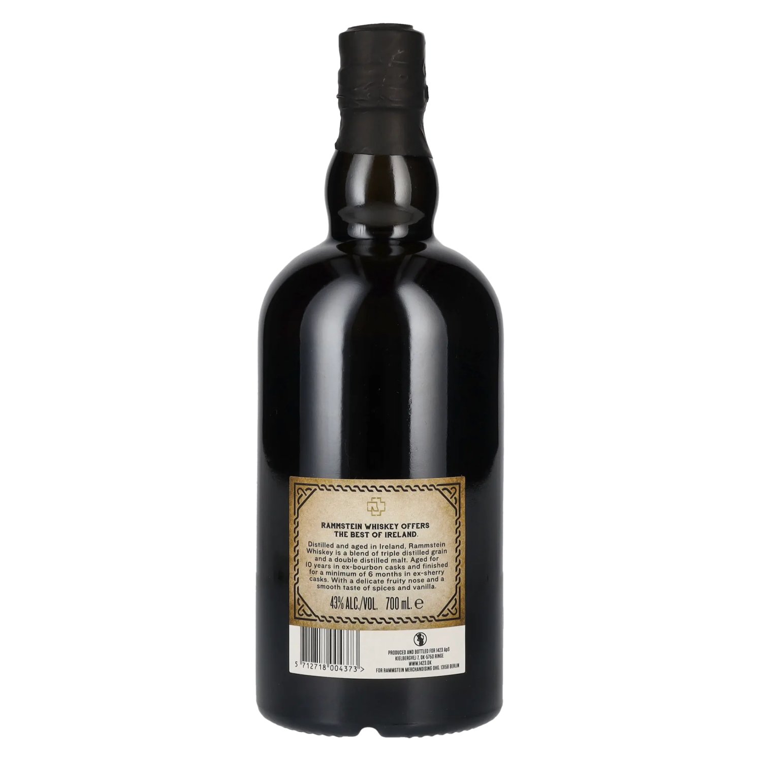 Der Rammstein Irish Whiskey stammt aus Irland und ist ein sorgfältig komponierter Blend, der die Feinheiten zweier Destillationsverfahren vereint: Er besteht aus einem dreifach destillierten Grain Whiskey und einem doppelt destillierten Malt Whiskey. Über einen Zeitraum von 10 Jahren reift er in Ex-Bourbon-Fässern, was ihm reichhaltige Vanille- und Eichenholznoten verleiht. Anschließend erhält er durch eine mindestens sechsmonatige Nachreifung in Ex-Sherry-Fässern seine unverwechselbaren fruchtigen und nussigen Aromen, die den Whiskey besonders rund und komplex machen.