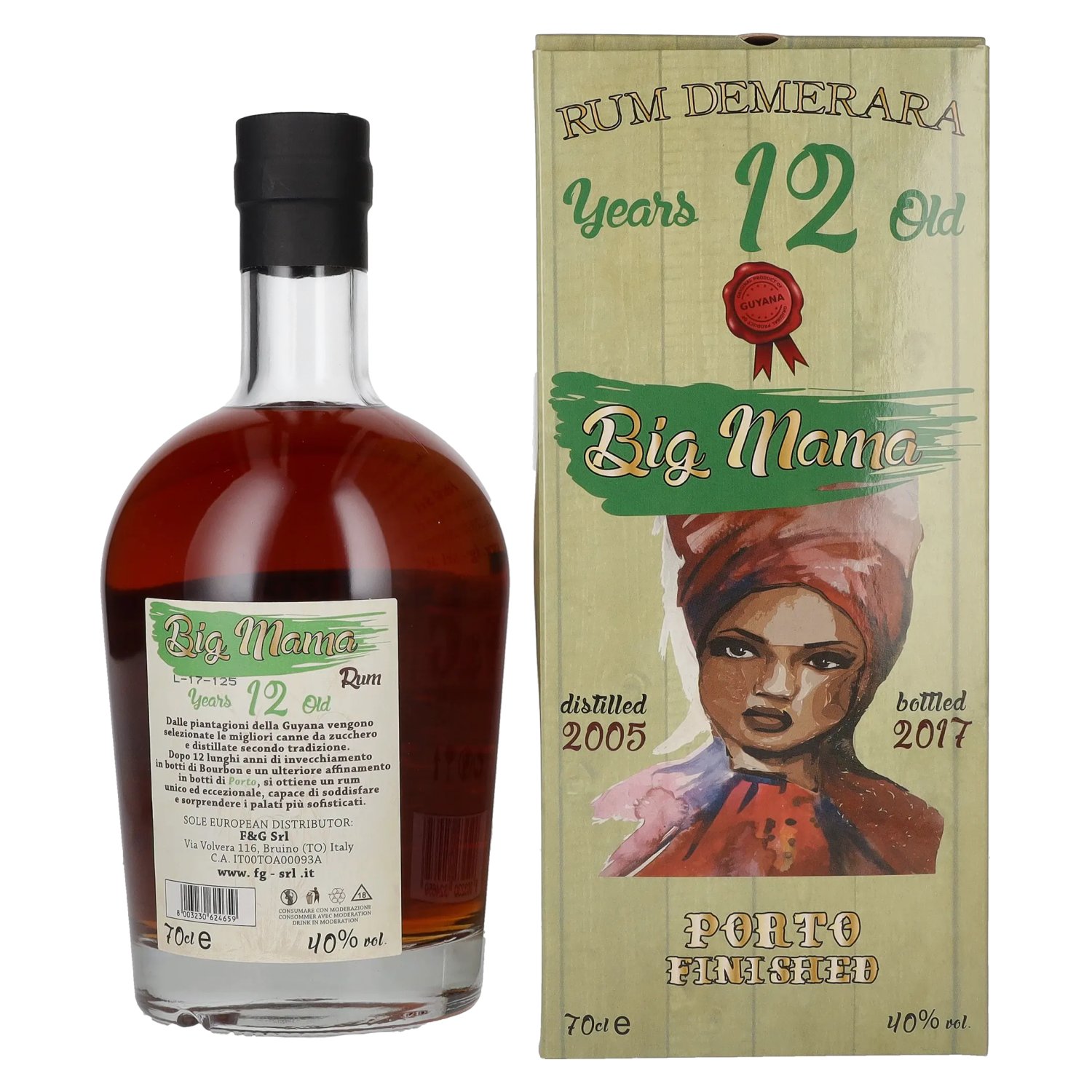 Der Big Mama 12 Years Old Rum Demerara Porto Finished mit 40 % Vol. ist ein exzellenter Rum aus der berühmten Demerara-Region in Guyana, bekannt für seine hochqualitativen Rums mit komplexen und kraftvollen Aromen. Dieser 12 Jahre alte Rum wurde in Demerara-Fässern gereift und anschließend für eine Zusatzreifung in Portwein-Fässern veredelt. Diese Porto Finish-Reifung verleiht dem Rum eine besonders reichhaltige, fruchtige Komplexität und sorgt für eine perfekte Balance zwischen den süßen und gewürzigen Noten.