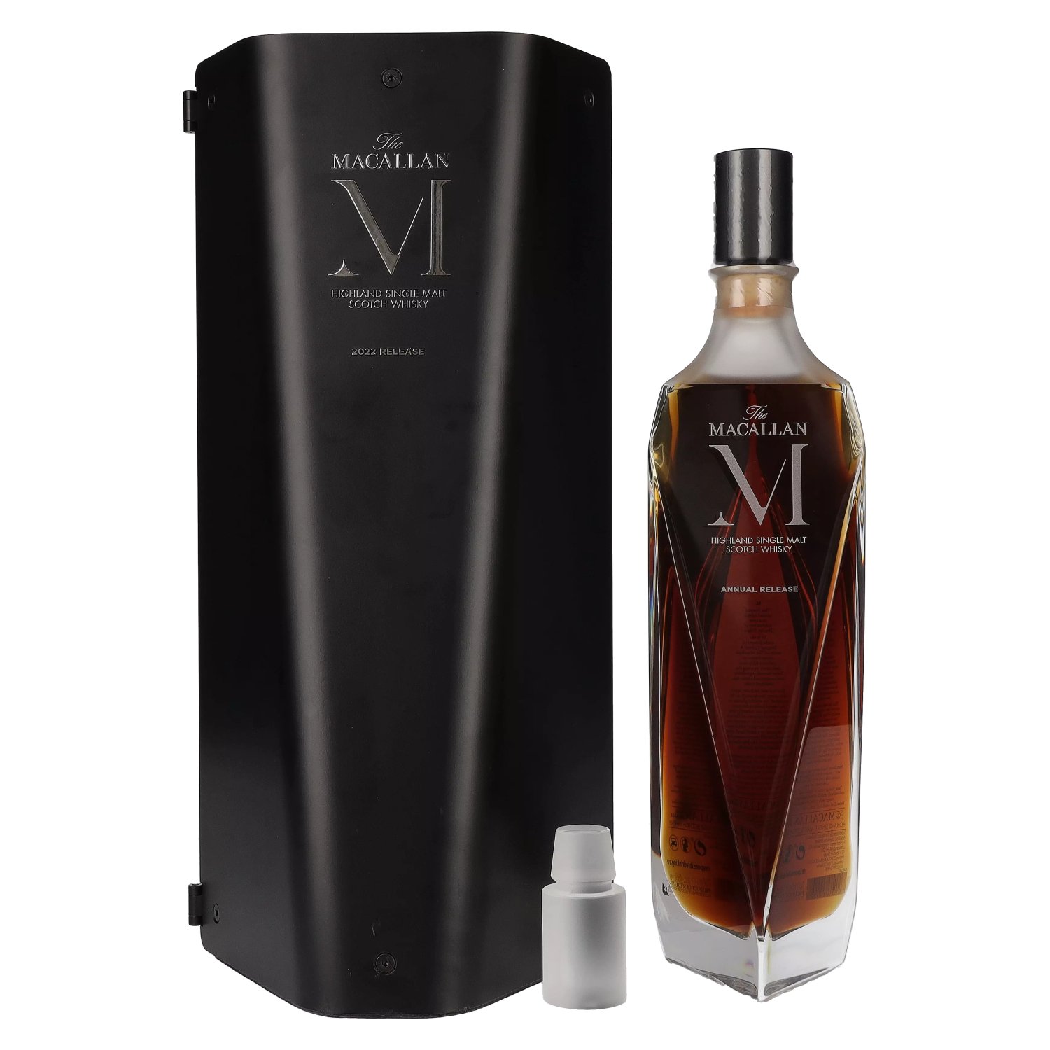 Der The Macallan M 2022 ist eine der dunkelsten Abfüllungen von The Macallan. Die Flasche, entworfen in Zusammenarbeit mit Fabien Baron und Lalique, präsentiert sich als ausdrucksstarker Dekanter in Form eines schwarzen Kristalls. Lalique, eines der führenden Unternehmen in der Kristallglasindustrie in Frankreich, und Fabien Baron, Creative Director der Marke Baron & Baron, brachten ihre Expertise in das Design ein.