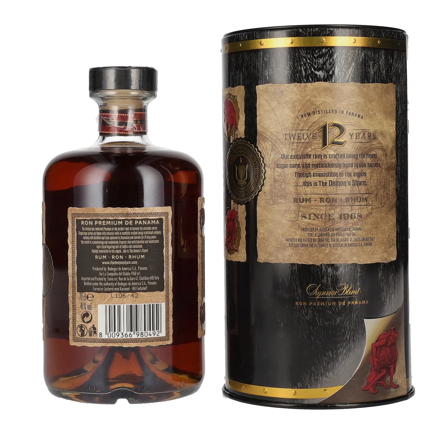 Mit einem Alkoholgehalt von 41 % Vol. bietet dieser 12 Jahre gereifte Rum eine weiche, vollmundige Textur mit einem lang anhaltenden, angenehm würzigen Abgang. Die Marke The Demon’s Share steht für exklusive Rum-Spezialitäten mit einem rebellischen Charakter, die sich durch meisterhafte Handwerkskunst in der Rum-Herstellung auszeichnen. Die edle Tinbox macht diesen hochwertigen Rum nicht nur zu einem geschmacklichen Highlight, sondern auch zu einem besonderen Geschenk für Rum-Liebhaber. Verkosternotiz: Farbe: Sattes Gold mit bernsteinfarbenen Reflexen.
