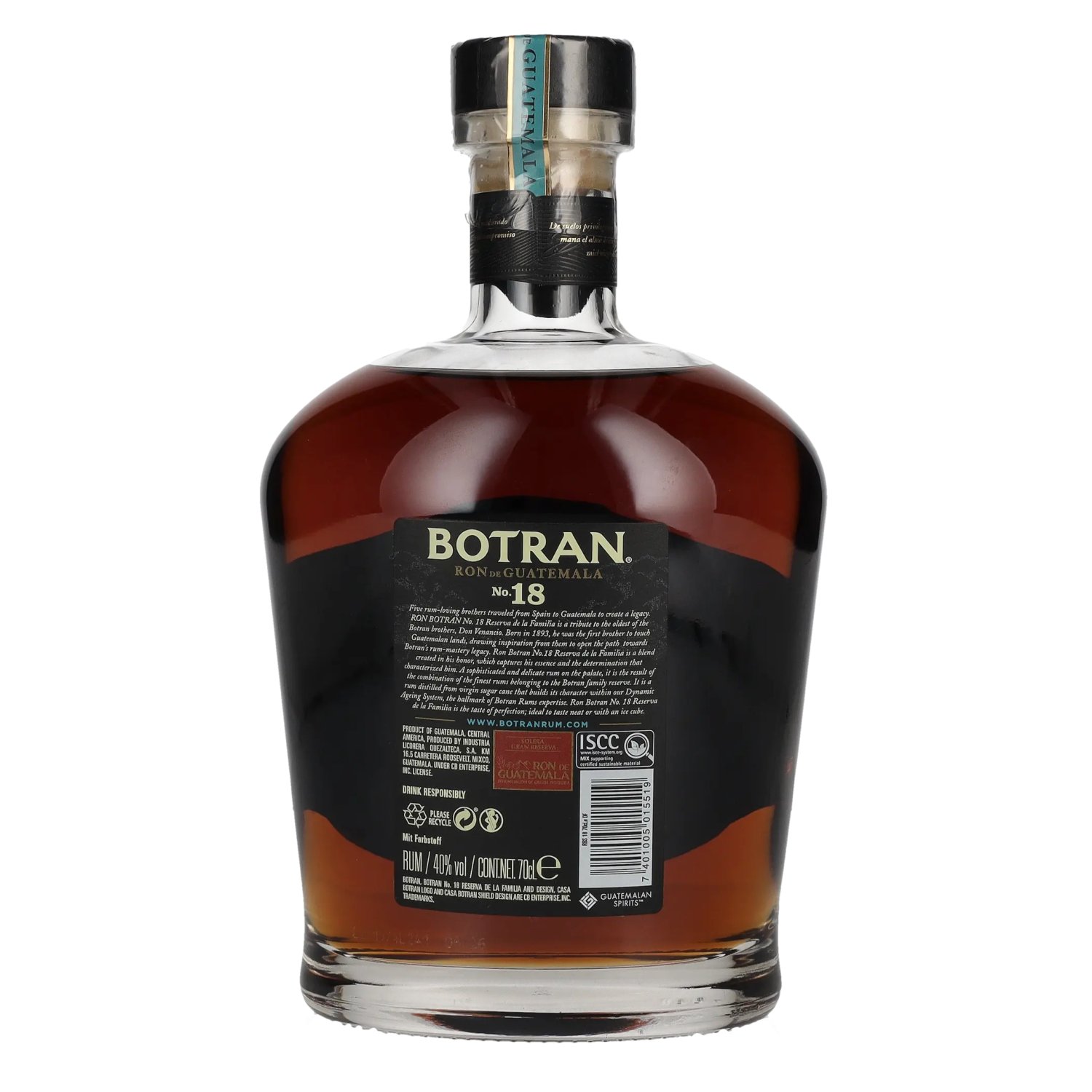 Der Botran Ron Añejo No. 18 Reserva de la Familia mit 40 % Vol. ist ein erstklassiger Añejo Rum aus Guatemala, der mit großer Sorgfalt und Tradition hergestellt wird. Dieser Rum gehört zur Reserva de la Familia-Serie und ist das Ergebnis einer ausgewogenen Mischung aus reiferen Rums und einer speziellen Reifung in einer Vielzahl von Fässern, darunter Bourbon- und Sherry-Fässer. Diese vielschichtige Fassreifung verleiht dem Botran No. 18 seine charakteristische Komplexität und Tiefe, was ihn zu einem echten Genusserlebnis macht.