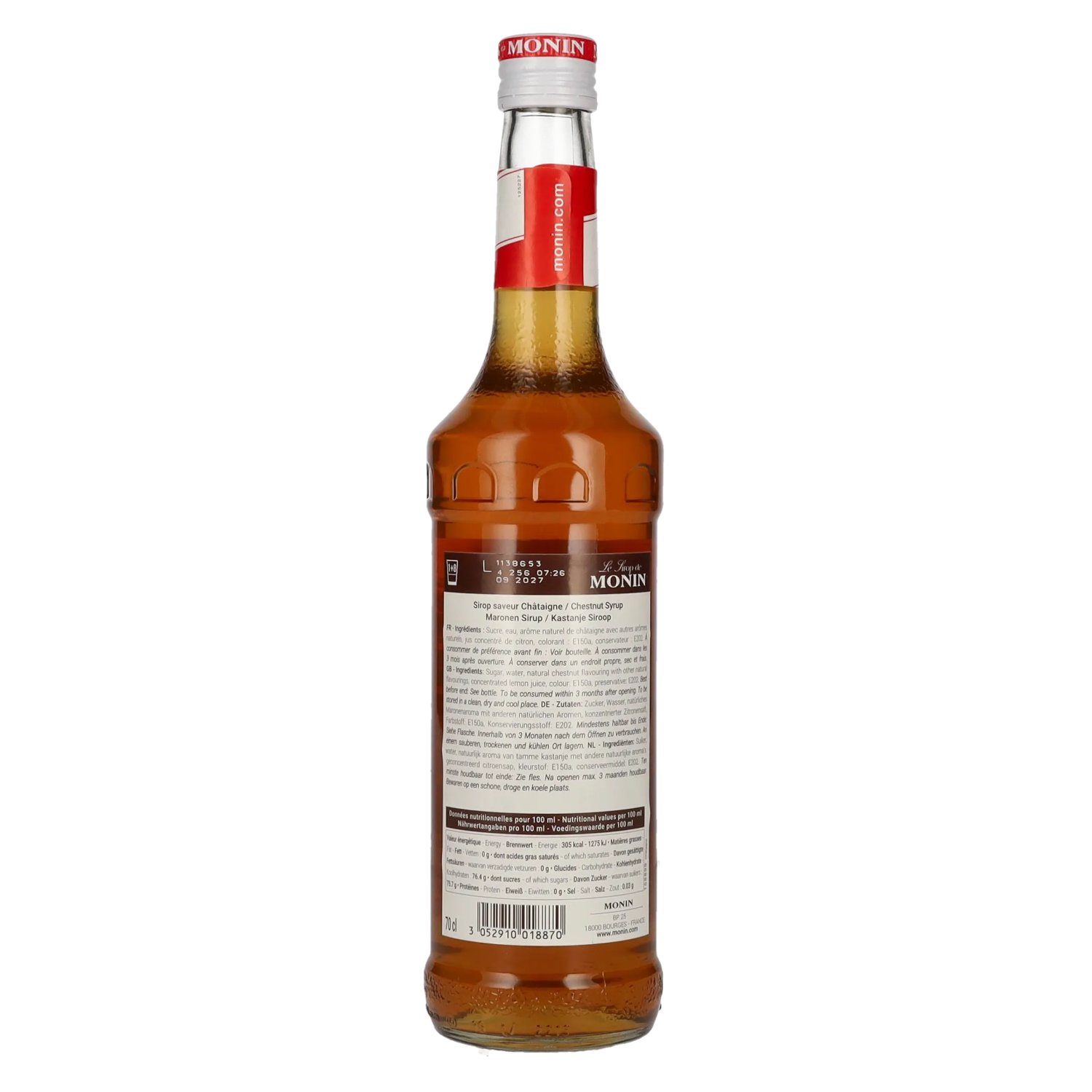 Zutaten:Zucker, Wasser, natürliches Maronenaroma mit anderen natürlichen Aromen, konzentrierter Zitronensaft, Farbstoff: E150a, Konservierungsstoff: E202