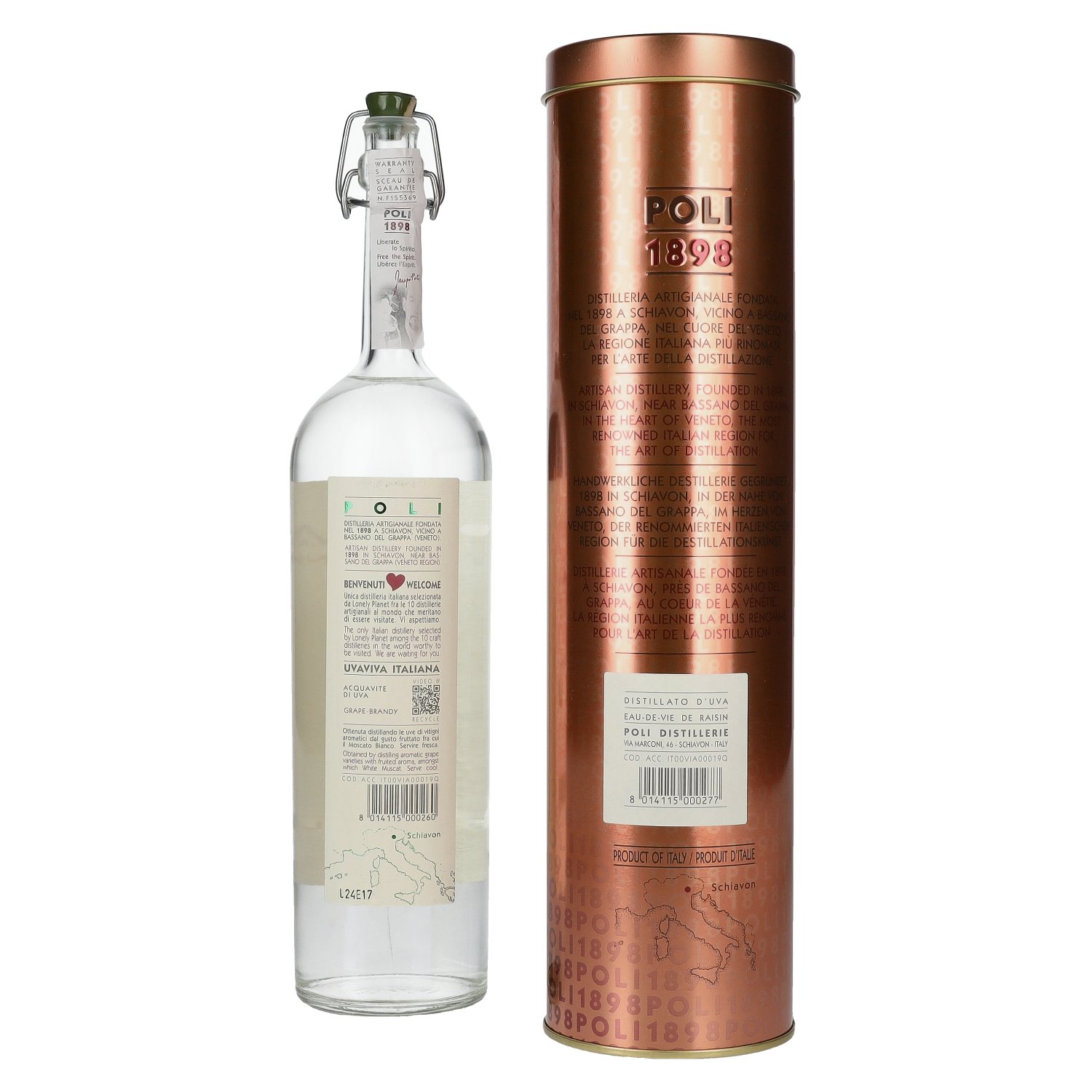 Der Poli UVAVIVA Italiana 40% Vol. 0,7 l in Tinbox ist ein eleganter italienischer Traubenbrand, der die Handwerkskunst und Leidenschaft der traditionsreichen Poli Distillerie verkörpert. Seit 1898 steht die Brennerei in Schiavon bei Bassano del Grappa für höchste Qualität, Transparenz und die Bewahrung klassischer Destillationstradition.