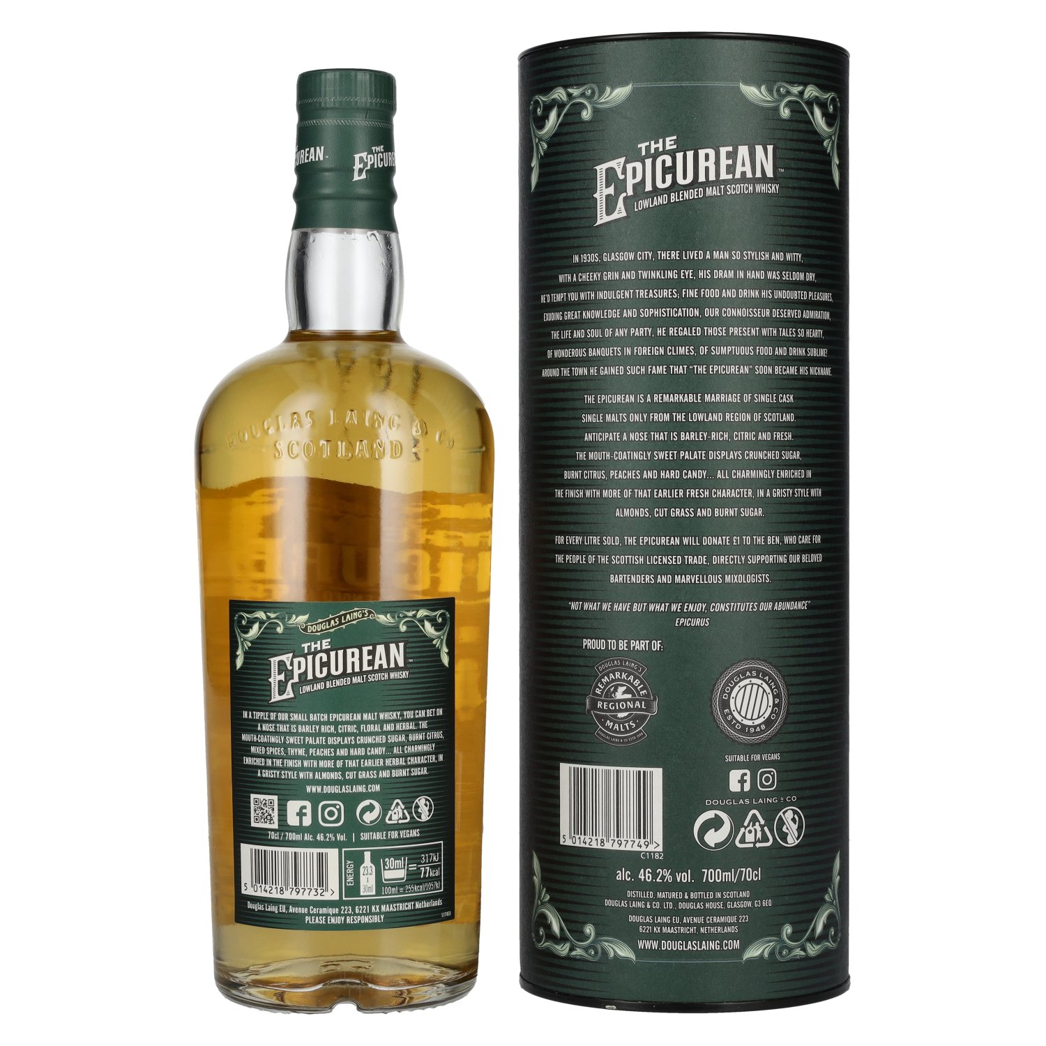 Douglas Laing THE EPICUREAN Lowland Blended Malt is an exquisite whisky creation that combines the elegance and finesse of the Scottish Lowlands in a harmonious composition. With an alcohol content of 46.2% vol. in a 0.7 liter bottle, presented in a stylish gift box (UK), this blended malt whisky is a tribute to the fine, floral and fruity notes of the Lowland region.
