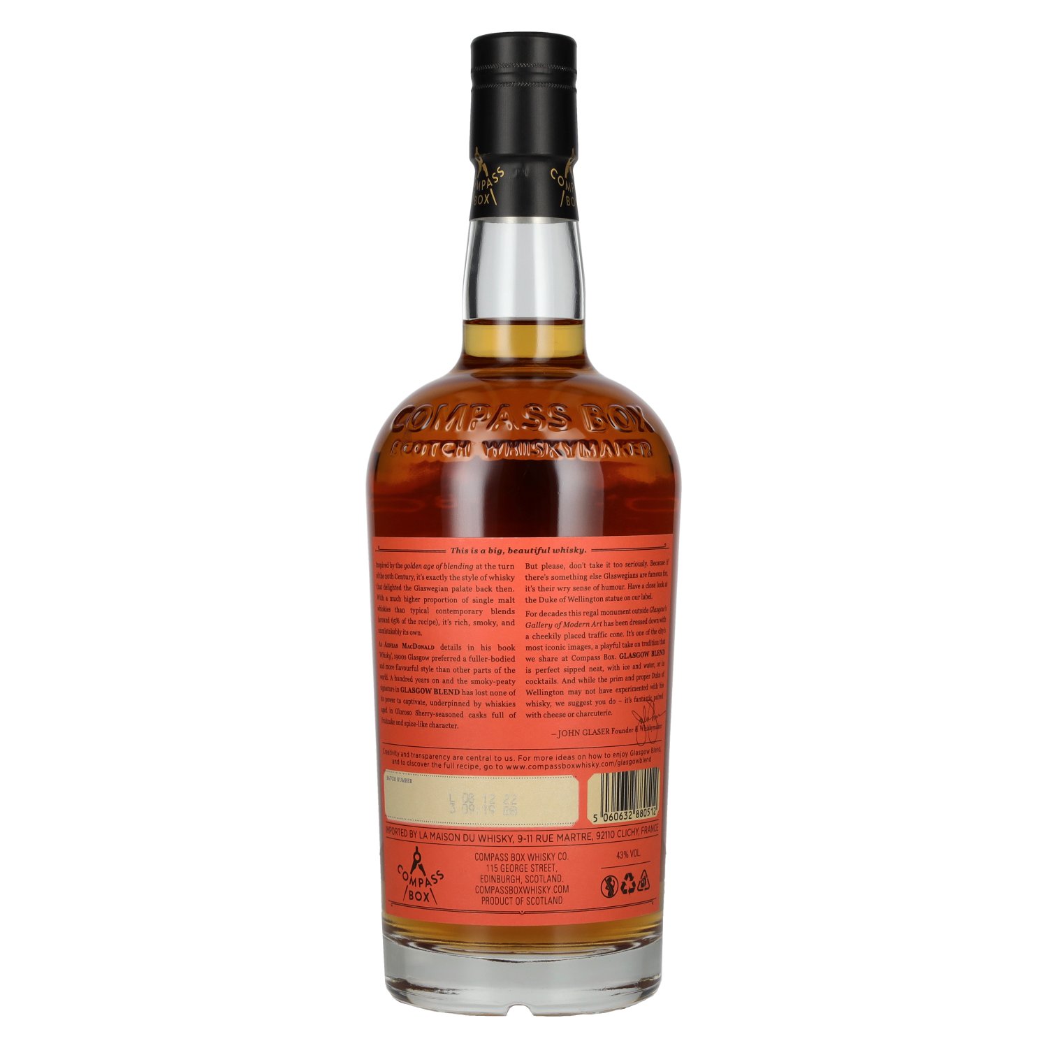 The Compass Box Glasgow Blend is ideal for pure enjoyment, ideally with a few drops of water to fully develop its variety of aromas. It also works well in classic whisky cocktails such as a Rob Roy or a Smoky Old Fashioned. Thanks to its peaty and sherried nuances, it is a perfect choice for connoisseurs looking for a strong yet well-balanced blended Scotch whisky.