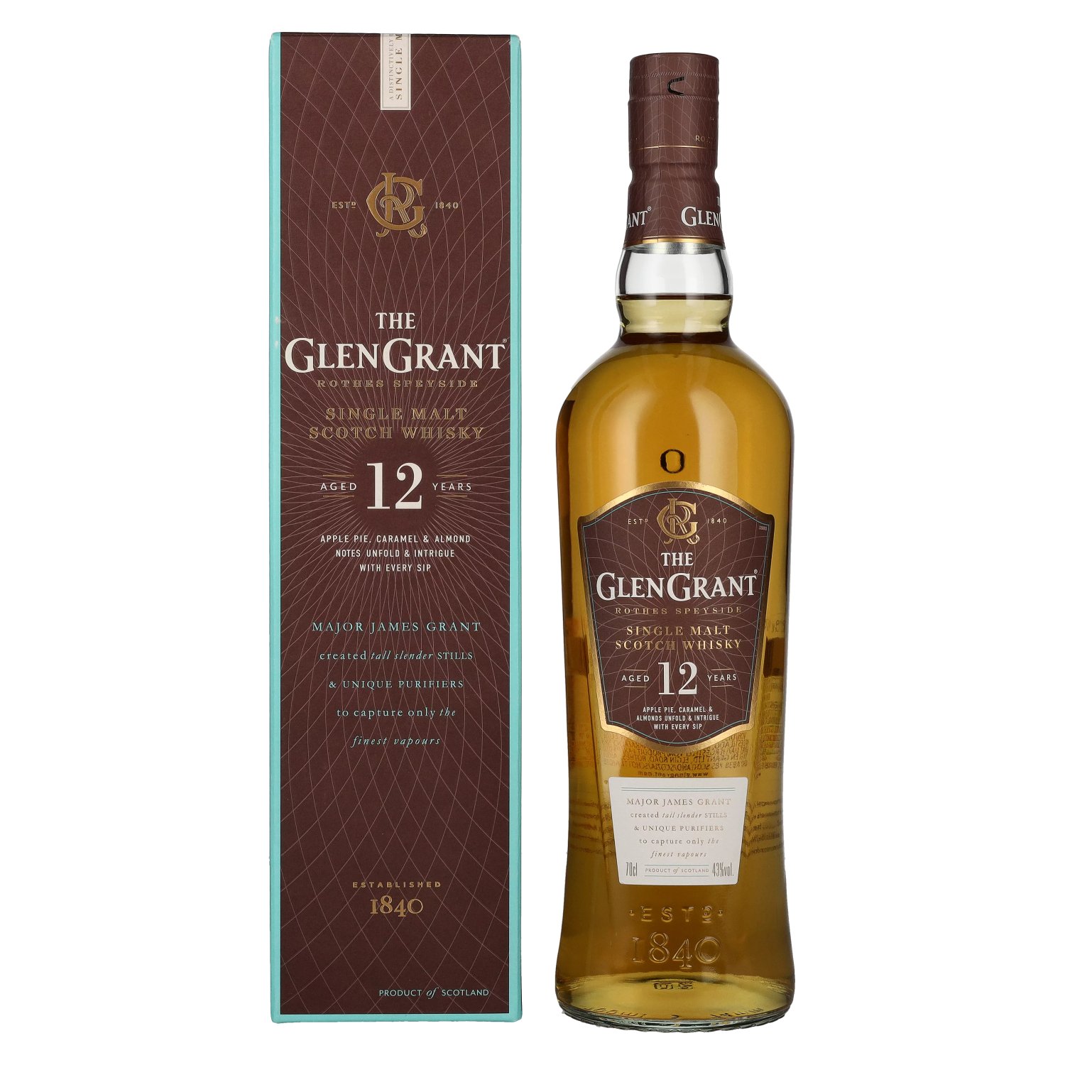 This 12-year-old single malt is produced by distillation in traditional pot stills, with the whisky maturing for 12 years in a combination of American and European oak casks. The maturation in different cask types ensures a balanced maturation, where fruity notes of apples and pears harmonize perfectly with the subtle oak spice. The end result is a full-bodied and complex whisky that reflects the expertise of the Glen Grant Distillery and is one of its most popular bottlings.