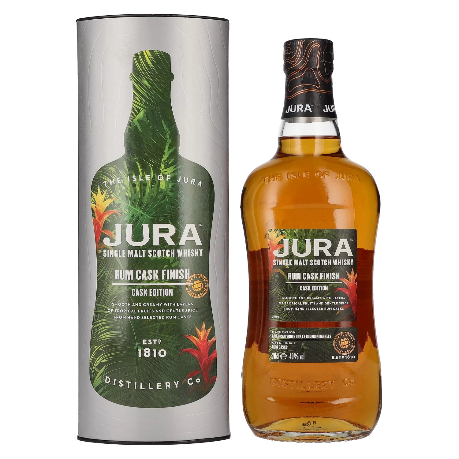 Taste: Full-bodied and complex with notes of grilled fruit, caramel, rum raisin and a fine oak spice. The influence of the rum casks gives the whisky a pleasant sweetness and fruitiness that blends wonderfully with the traditional Jura flavors.