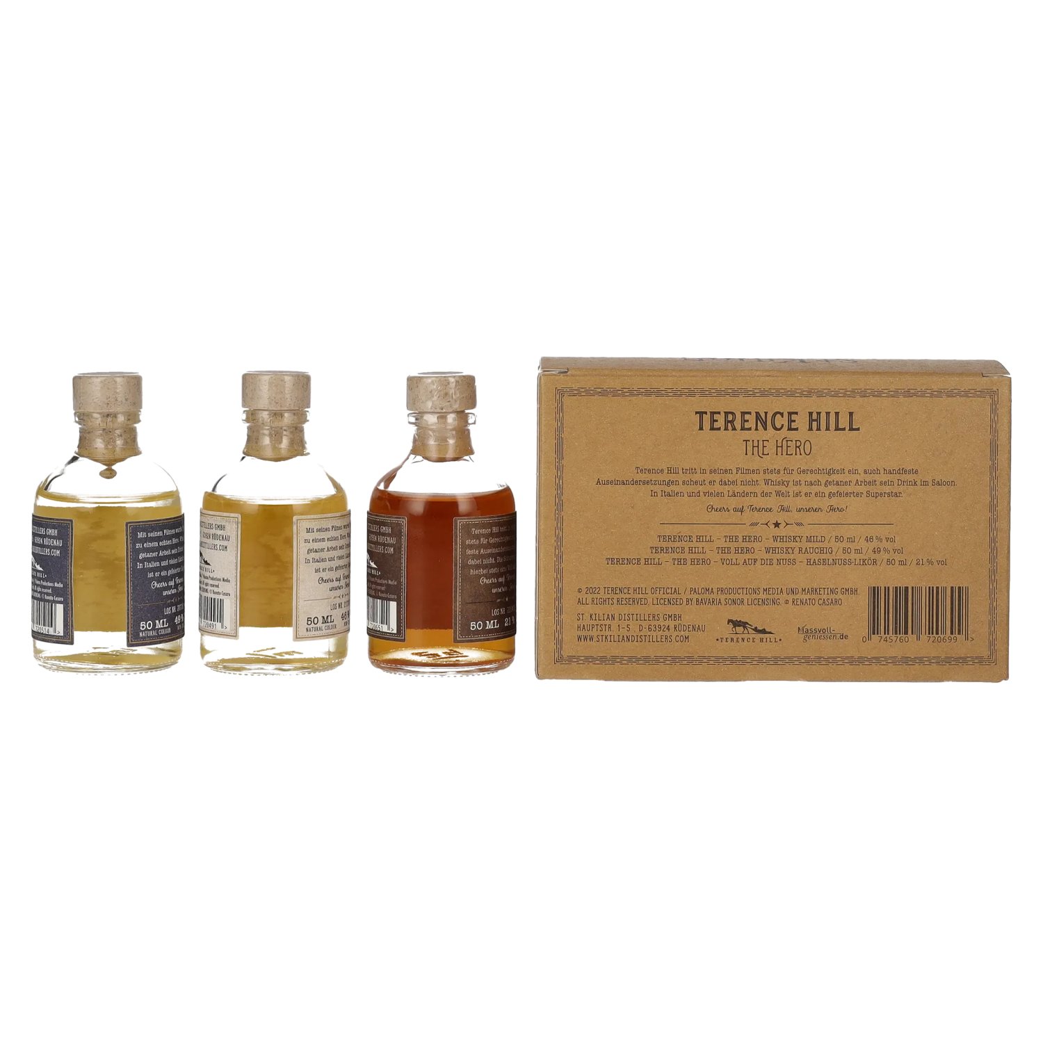 At St. Kilian Distillers, a premium liqueur is created based on highly aromatic hazelnuts. The basis for the liqueur is the mild St. Kilian Single Malt Spirit. (automated translation) Tasting notes: -Terence Hill THE HERO Whisky Mild 46% Vol.