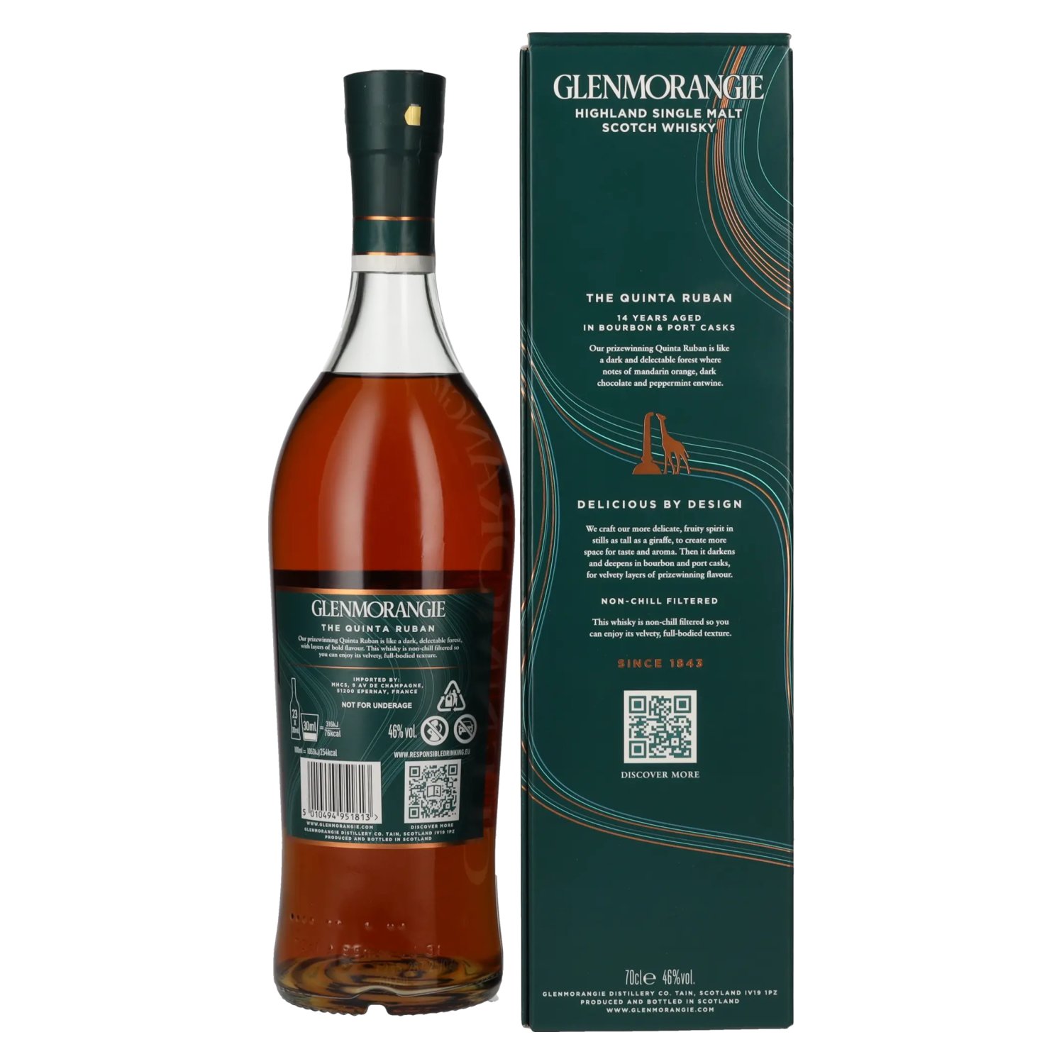 After initially maturing for ten years in ex-bourbon casks, the whisky spends a further four years in these port casks, giving it added complexity and rich fruity notes. This method of maturation not only gives the Glenmorangie Quinta Ruban its characteristic color, but also a rich, multi-layered aroma. This whisky is bottled without chill-filtering.