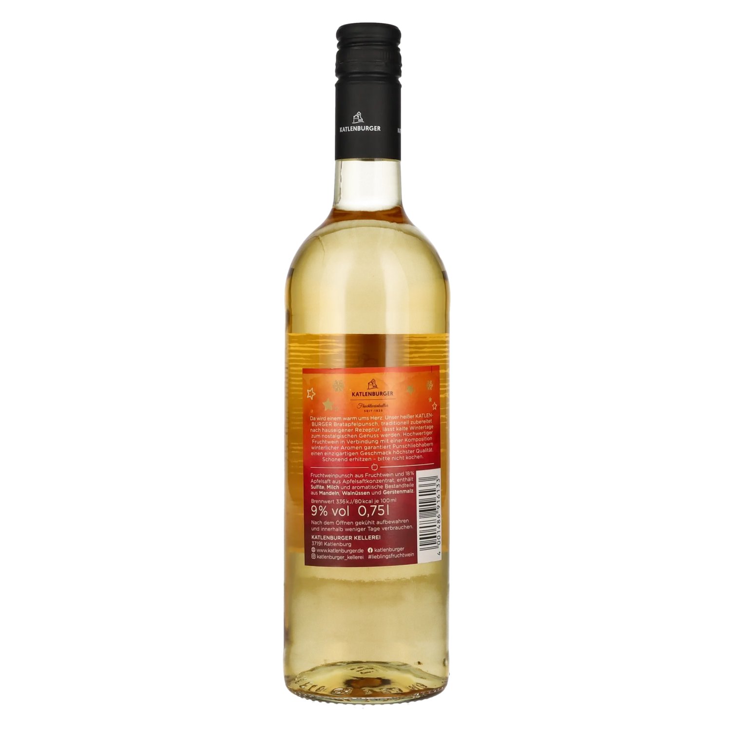 Ingredients:Fruchtweinpunsch aus Fruchtwein und 18% Apfelsaft aus Apfelsaftkonzentrat, enthält Sulfite, Milch und aromatische Bestandteile aus Mandeln, Walnüssen und Gerstenmalz.