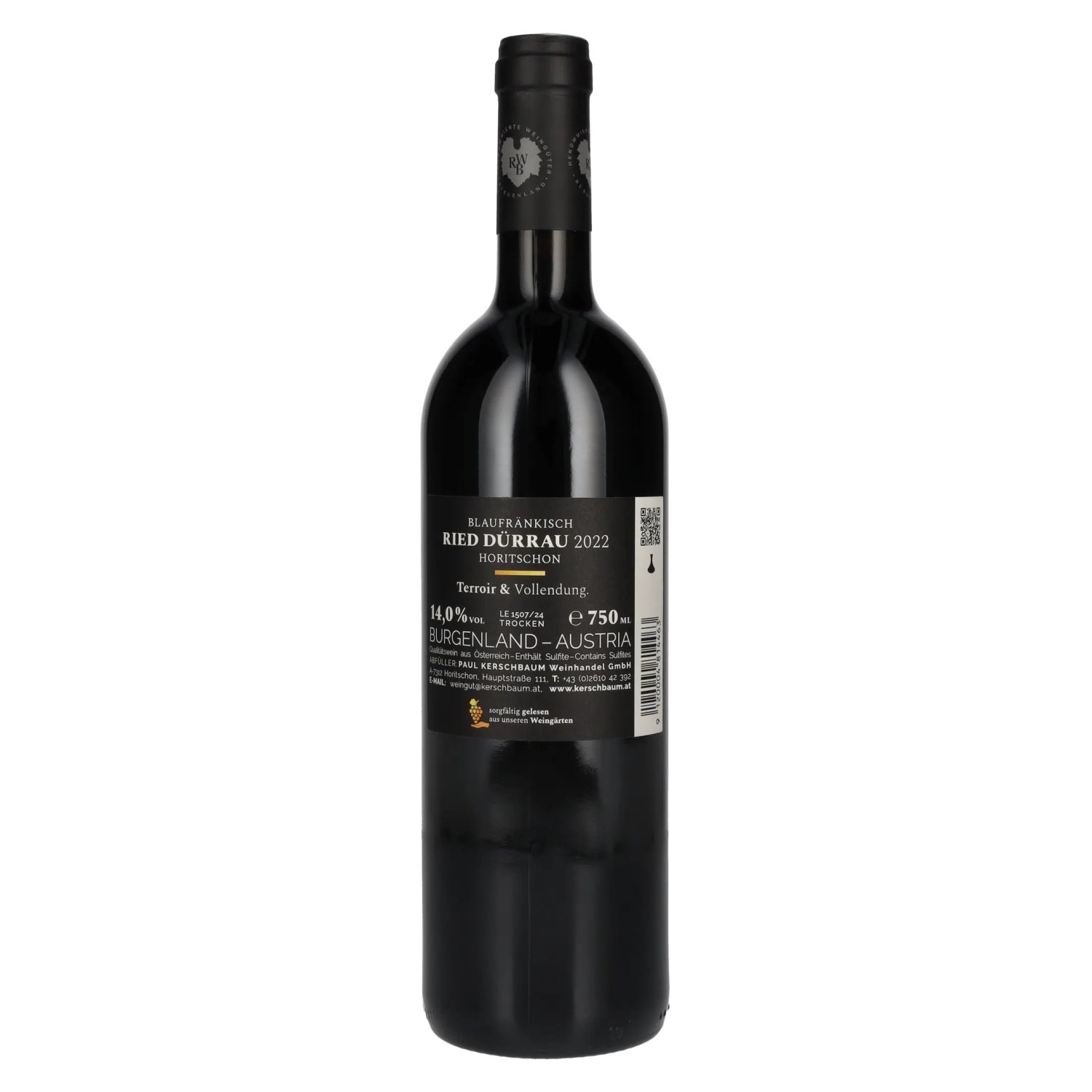 The grapes for the Blaufränkisch Ried Dürrau come exclusively from the renowned single vineyard Dürrau in Horitschon, one of the best sites in the region. The 21-day temperature-controlled mash fermentation gives the wine its dense structure and intense depth. The malolactic fermentation took place exclusively in wooden barrels, followed by 15 months of ageing. After maturing, the Blaufränkisch is bottled and sealed with a natural cork. (automated translation) Tasting notes: Dark ruby garnet with violet reflections in the glass. A fruity nose of black cherries and dark wild berries, accompanied by notes of precious wood. Juicy, extra-sweet, elegant on the palate, with fine fruit acidity, ripe tannins and a salty minerality. Long lasting finish.