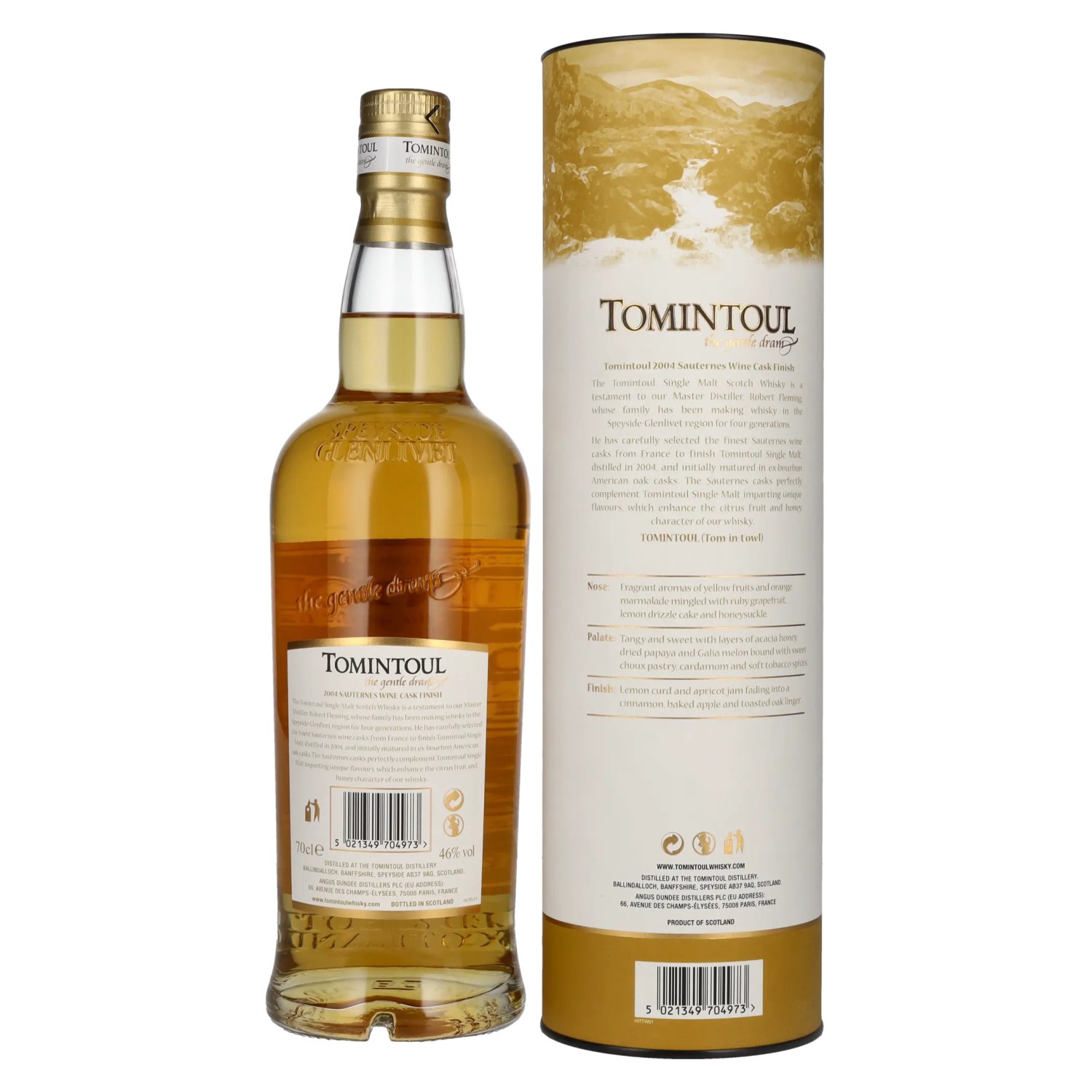 Tomintoul 16 Year Old The Gentle Dram is an exquisite single malt Scotch whisky that masterfully combines the gentle and mild signature of the Tomintoul distillery with the opulent notes of a Sauternes wine cask. After extensive maturation in ex-bourbon American oak casks, this whisky was given a final finish in selected Sauternes wine casks, which are prized for their rich, sweet and complex aromas.