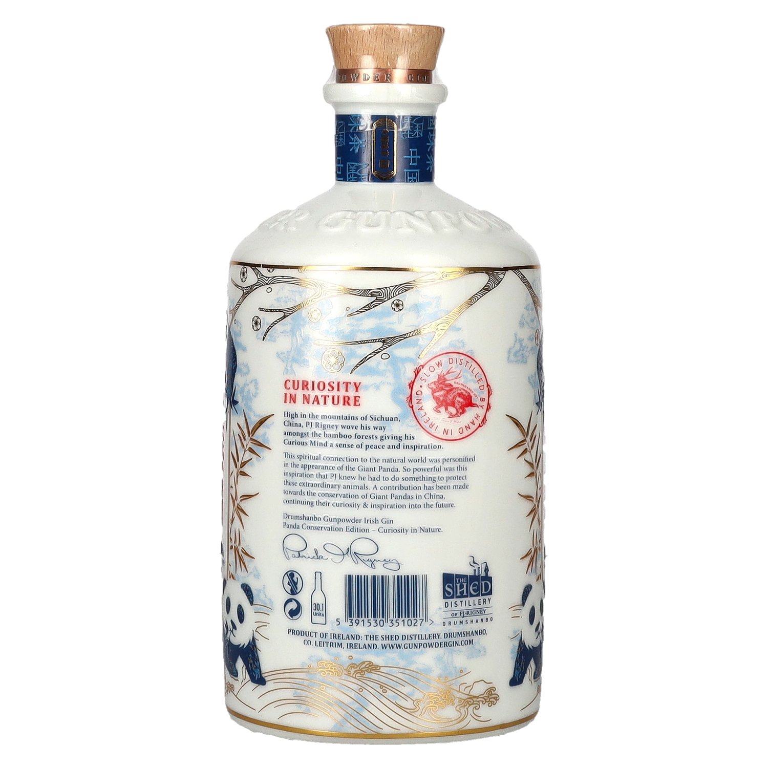 The Drumshanbo Gunpowder Irish Gin Panda Conservation Edition is a special bottling of the award-winning Gunpowder Irish Gin from The Shed Distillery in Drumshanbo, Ireland. With an alcohol content of 43% vol. and the well-known combination of classic gin botanicals and Asian gunpowder tea, this edition combines outstanding taste with a charitable cause: part of the proceeds support projects to protect the endangered panda bears - a strong statement for sustainability and closeness to nature.