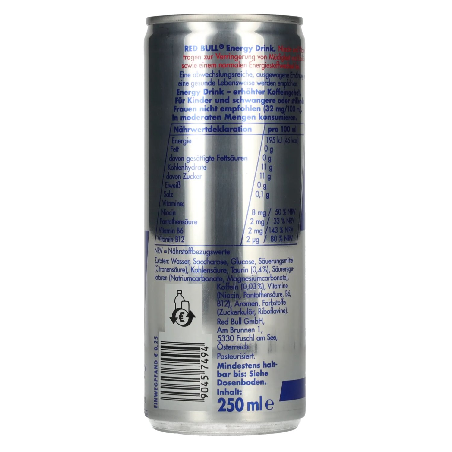 Ingredients:Wasser, Saccharose, Glucose, Säuerungsmittel (Citronensäure), Kohlensäure, Taurin (0,4%), Säureregulatoren (Natriumcarbonate, Magnesiumcarbonate), Koffein (0,03%), Vitamine (Niacin, Pantothensäure, B6, B12), Aromen, Farbstoffe (Zuckerkulör, Riboflavine)