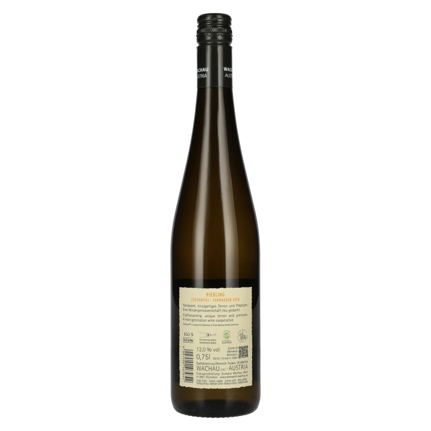 With an alcohol content of 12.5% vol., this wine is ideal for connoisseurs looking for a dry, elegant white wine with expression and finesse. (automated translation) Tasting notes: The Riesling Federspiel Terrassen 2024 presents itself in the glass in a bright, clear lemon yellow with greenish reflections. The nose reveals an animating interplay of aromas of ripe peach, lemon, apricot and floral notes, accompanied by a subtle minerality. On the palate, it is fresh, juicy and straightforward, with a lively acidity that brilliantly highlights the fruit. The typical Wachau minerality gives the wine depth and a long, precise finish.