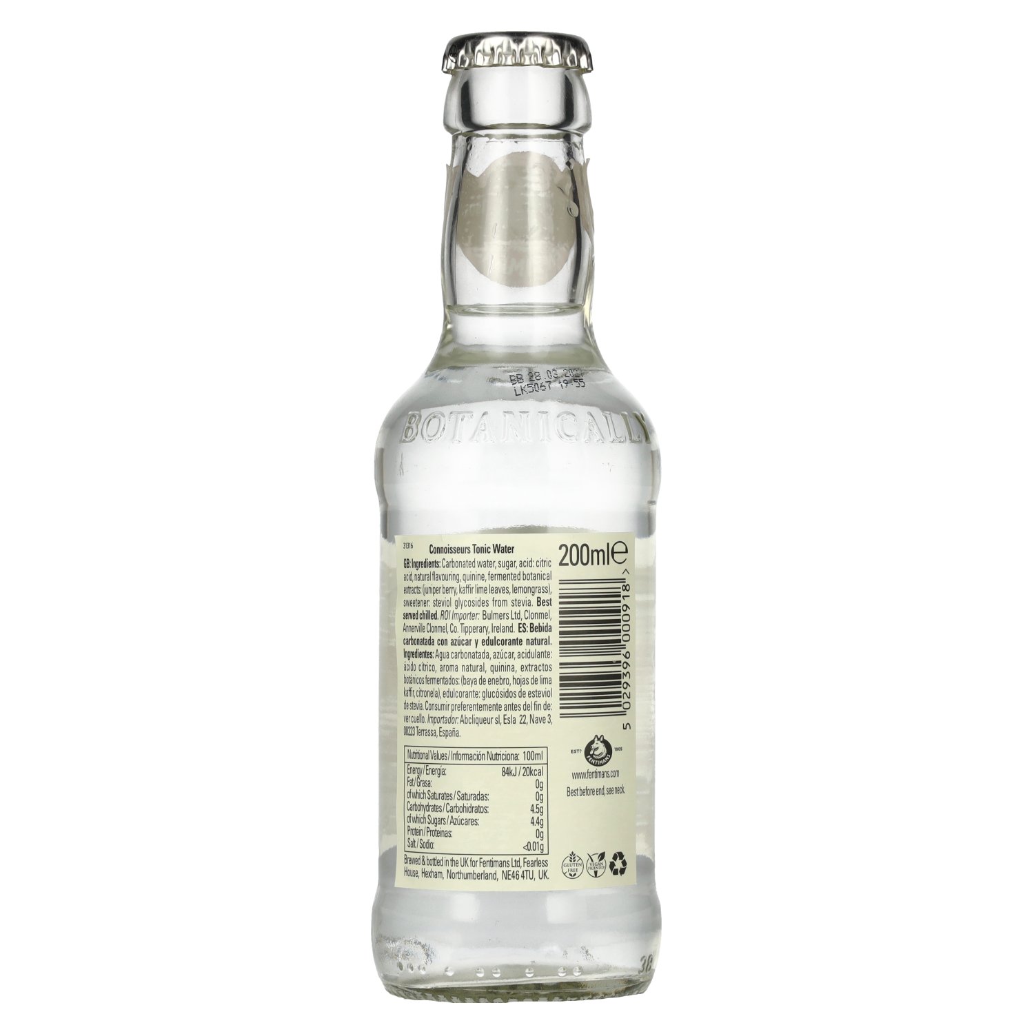 Brand: Ingredients:Carbonated water, sugar, acid: citric acid, natural flavouring, quinine, fermented botanical extracts: juniper berry, kaffir lime leaves, lemongrass), sweetener: steviol glycosides from stevia