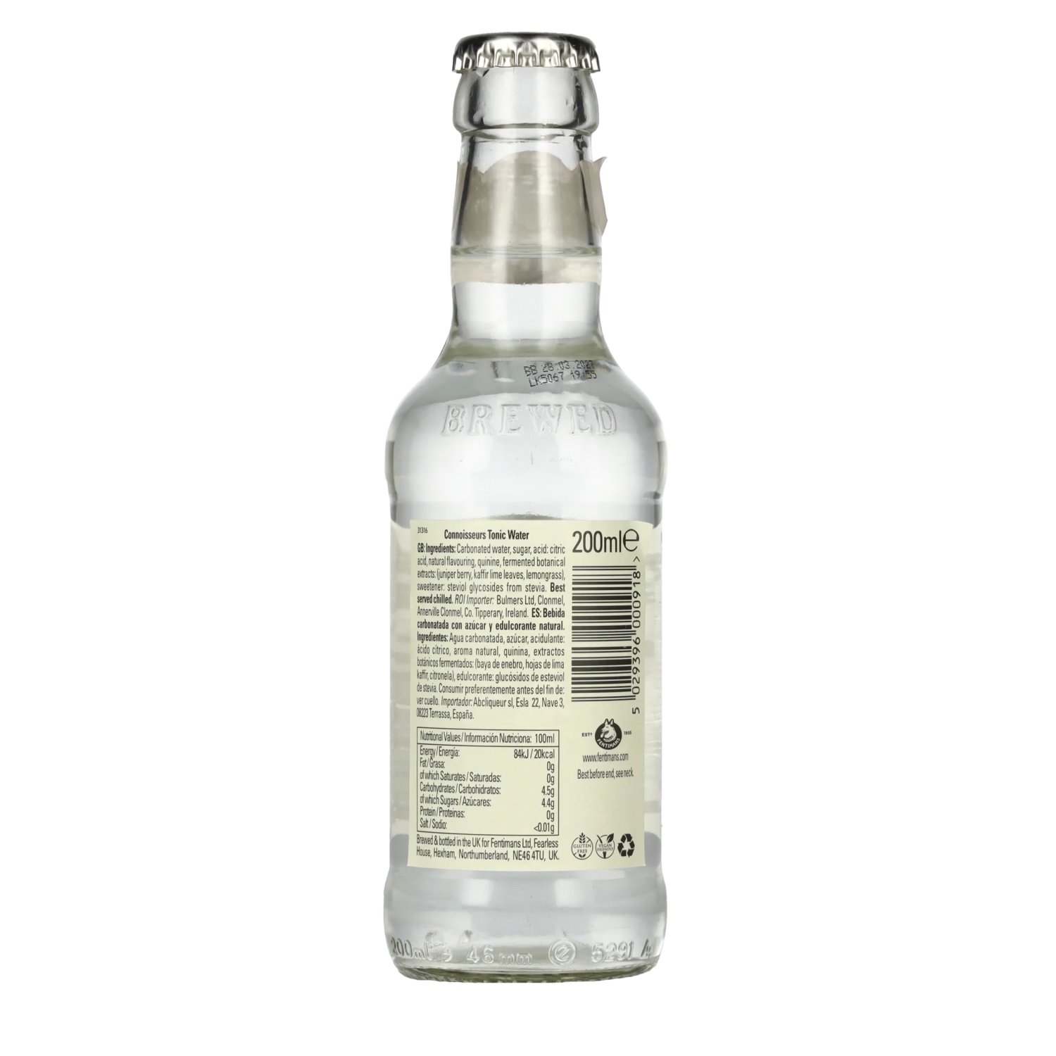 Brand: Ingredients:Carbonated water, sugar, acid: citric acid, natural flavouring, quinine, fermented botanical extracts: juniper berry, kaffir lime leaves, lemongrass), sweetener: steviol glycosides from stevia