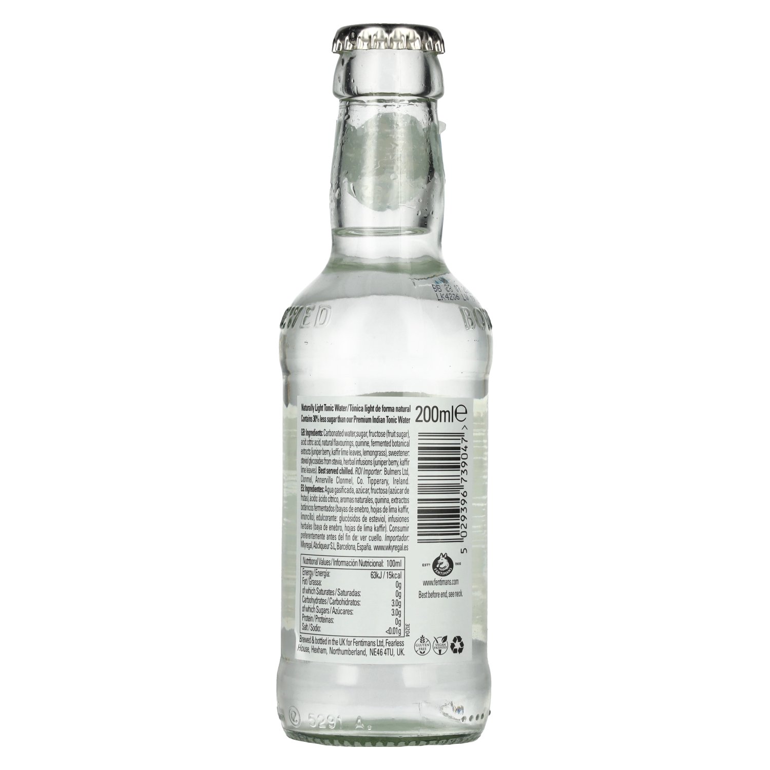 Ingredients:Carbonated water, sugar, fructose (fruit sugar), acid: citric acid, natural flavourings, quinine, fermented botanical extracts (juniper berry, kaffir lime leaves, lemongrass), sweetener: steviol glycosides from stevia, herbal infusions (juniper berry, kaffir lime leaves)