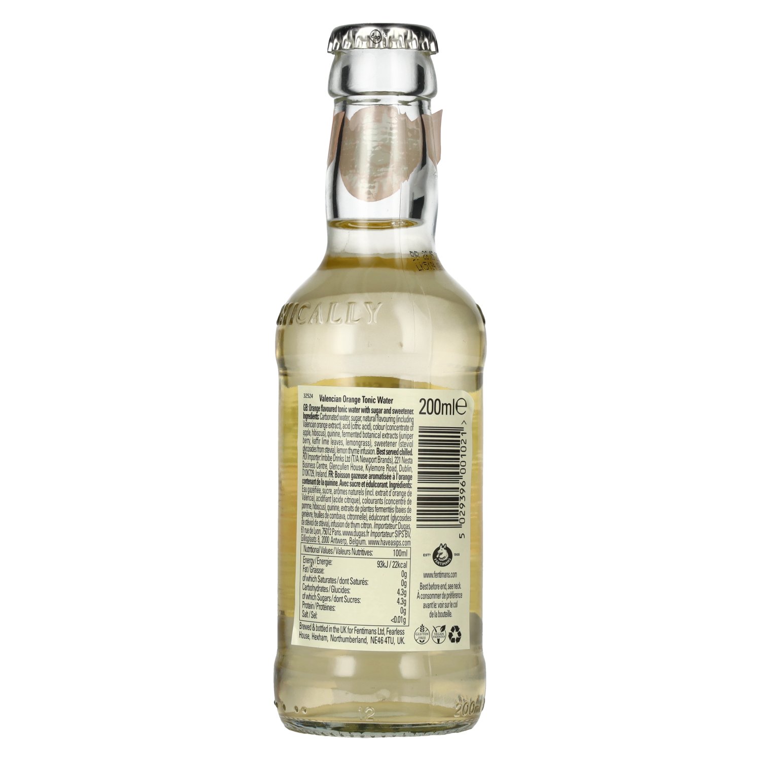 Carbonated water, sugar, natural flavouring (including Valencian orange extract), acid (citric acid), colour (concentrate of apple, hibiscus), quinine, fermented botanicals extracts (juniper berry, kaffir lime leaves, lemongrass), sweetener (steviol glycosides from stevia), lemon thyme infusion