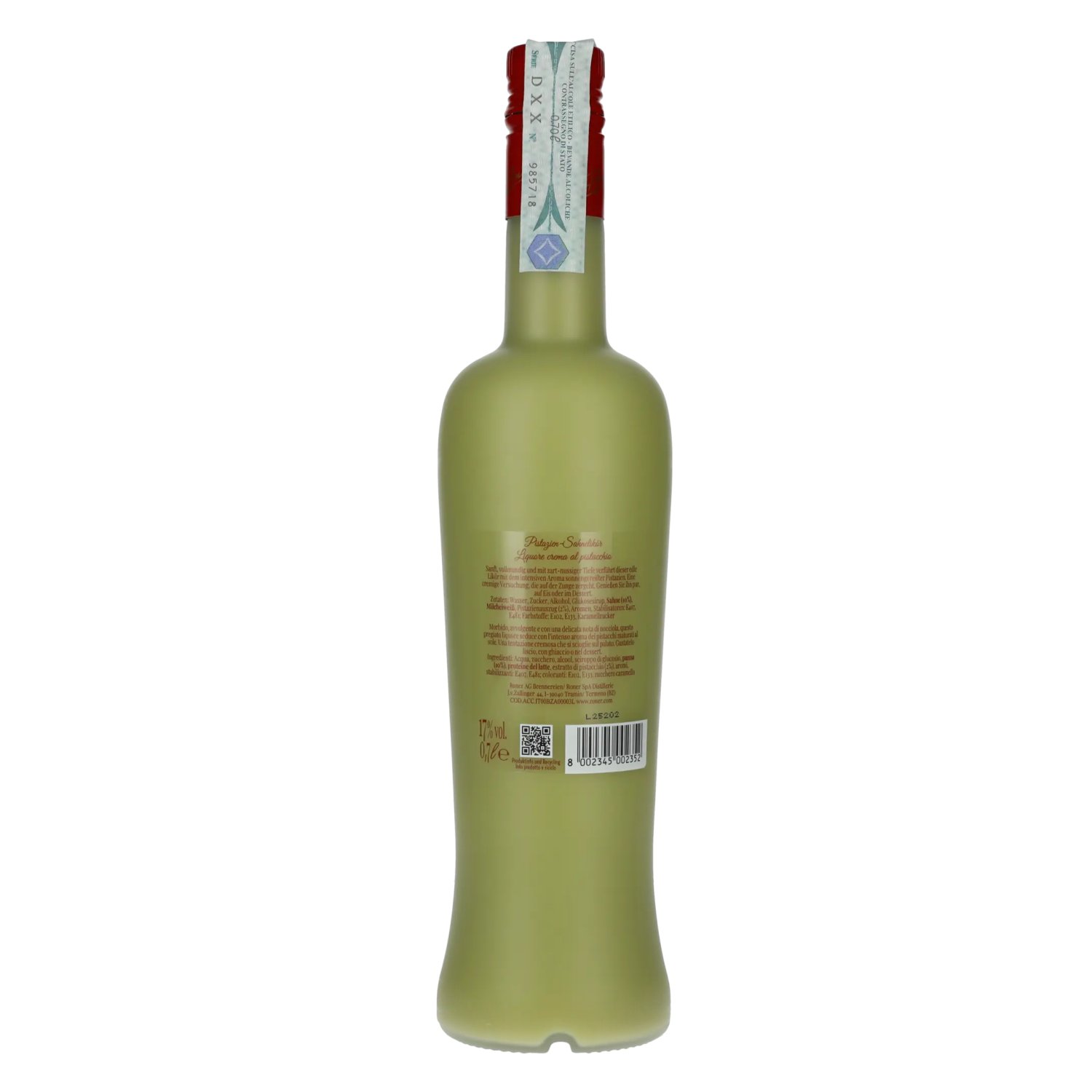 Brand: Ingredients:Wasser, Zucker, Alkohol, Glukosesirup, Sahne (10%), Milcheiweiß, Pistazienauszug (2%), Aromen, Stabilisatoren: E407, E481, Farbstoffe: E102, E133, Karamellzucker