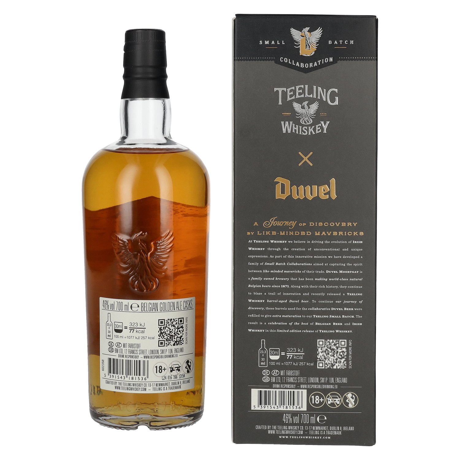 The whiskey was first matured in ex-bourbon casks and then given a unique finish for 24 months in Duvel Golden Ale Casks, which previously housed the iconic Duvel Tripel Hop beer. This combination gives the whiskey an unmistakable aroma of fruity, hoppy and malty notes. Bottled at 46% vol. and presented in an elegant gift box, the Teeling Duvel Collaboration Vol. 3 shows how harmoniously the aromas of fine Irish whiskey and Belgian beer full of character can blend together.