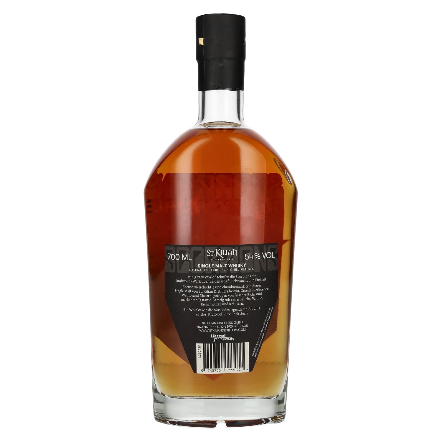 The St. Kilian Scorpions Crazy World Single Malt Whisky 54% vol. 0.7 l is an impressive tribute to German music history, craftsmanship and passion. This extraordinary special edition was created in cooperation between St. Kilian Distillers from Rüdenau in Bavaria and the legendary rock band Scorpions - inspired by the iconic album Crazy World from 1990.