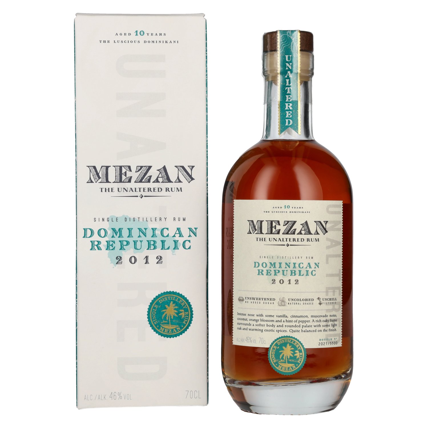 Mezan The Unaltered Rum Dominican Republic 2012 46% Vol. 0.7 l + GB is a single origin rum from the Dominican Republic with a strong character that stands for authenticity and unadulterated rum quality. The Mezan Rum brand is known for its strictly selected bottlings within a limited collection, in which only natural rums are presented. The approach of the Mezan The Unaltered Rum Series is based on presenting rum in its purest form: without added sugar, without colorants, not chill-filtered and characterized exclusively by careful barrel maturation.
