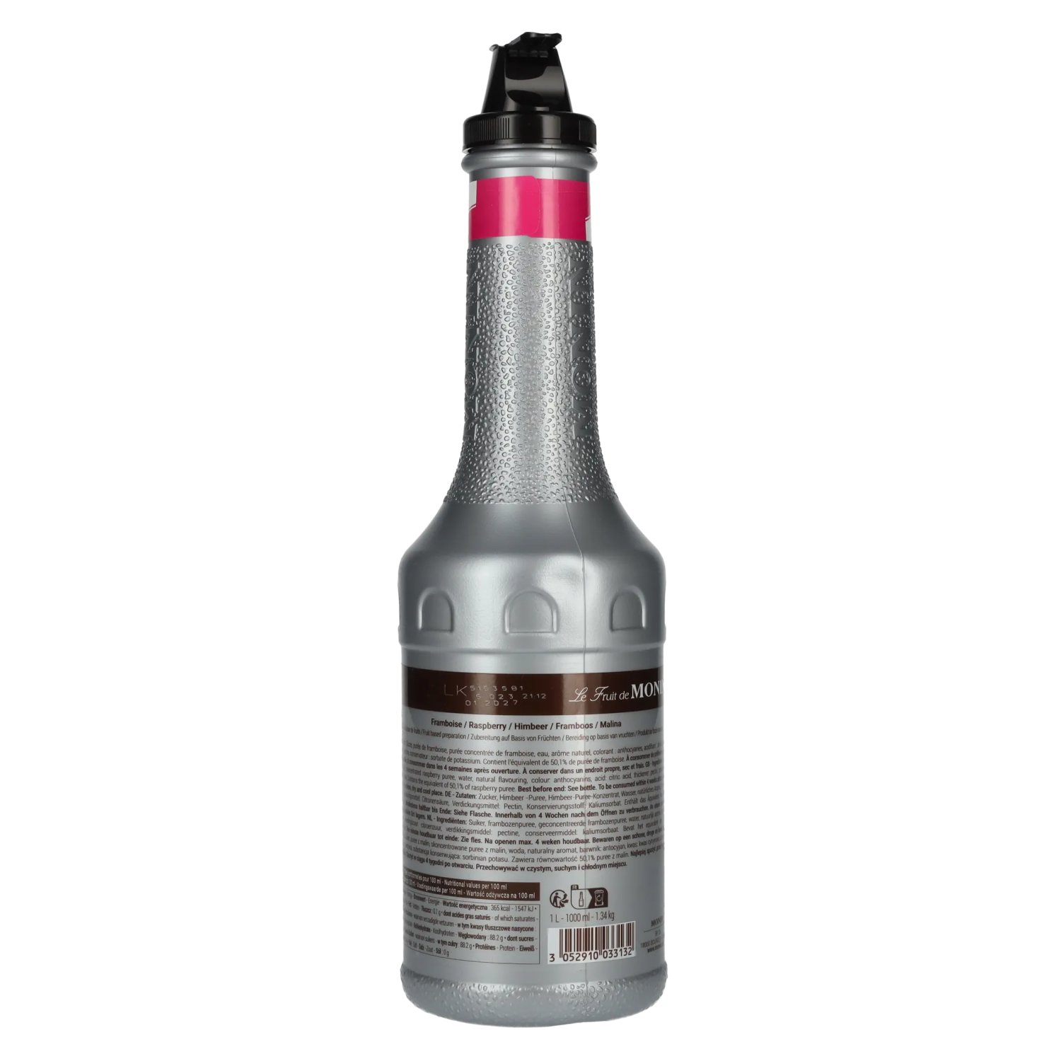 Ingredients:Zucker, Himbeer-Puree, Himber-Puree-Konzentrat, Wasser, natürliches Aroma, Farbstoff: Anthocyane, Säuerungsmittel: Citronensäure, Verdickungsmittel: Pectin, Konservierungsstoff: Kaliumsorbat, enthält das Äquivalent von 50,1% Himbeer-Puree