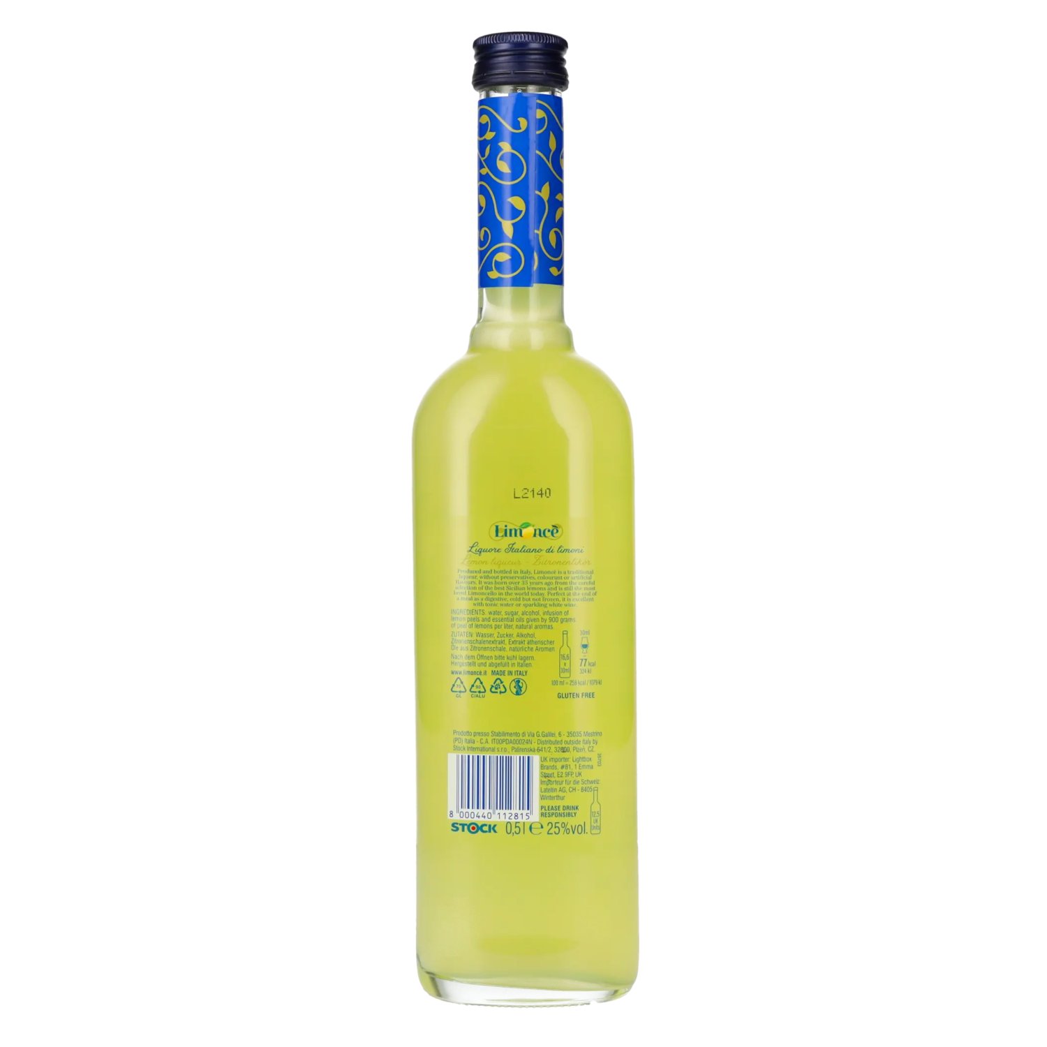 Ingredients:Wasser, Zucker, Alkohol, Zitronenschlaen-Mazerat und ätherische Öle aus 900g italienischen Zitronen pro Liter, natürliche Aromen.