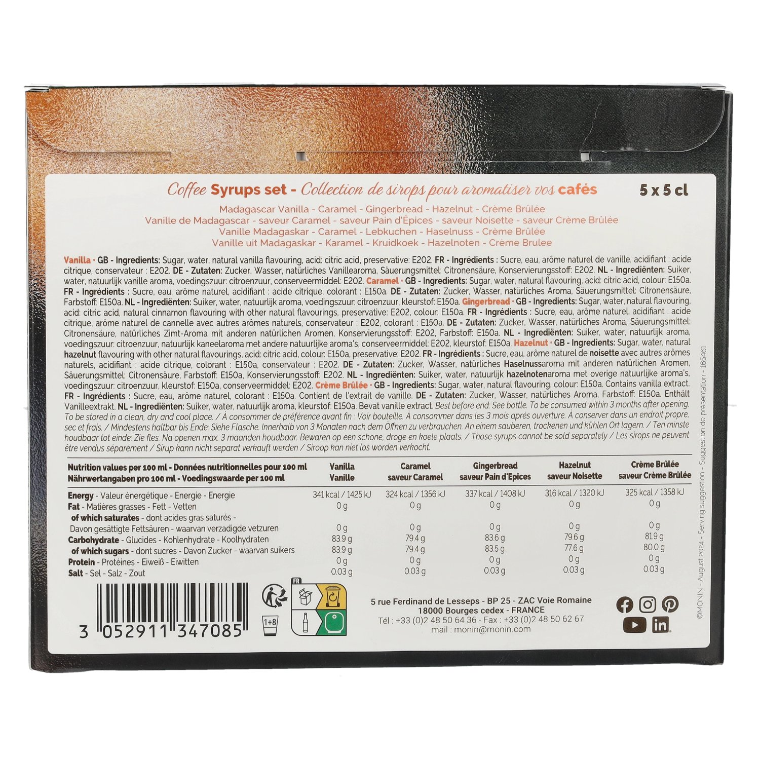 Ingrédients:Vanille: Zucker, Wasser, natürliches Vanillearoma, Säuerungsmittel: Zitronensäure, Konservierungsstoff: E202. Karamell: Zucker, Wasser, natürliches Aroma, Säuerungsmittel: Zitronensäure, Farbstoff: E150a. Lebkuchen: Zucker, Wasser, natürliches Aroma, Säuerungsmittel: Zitronensäure, natürliches Zimtaroma mit anderen natürlichen Aromen, Konservierungsstoff: E202, Farbstoff: E150a. Haselnuss: Zucker, Wasser, natürliches Haselnussaroma mit anderen natürlichen Aromen, Säuerungsmittel: Zitronensäure, Farbstoff: 150a, Konservierungsstoff: E202. Creme Brulee: Zucker, Wasser, natürliches Aroma, Farbstoff: E150a, enthält Vanilleextrakt.