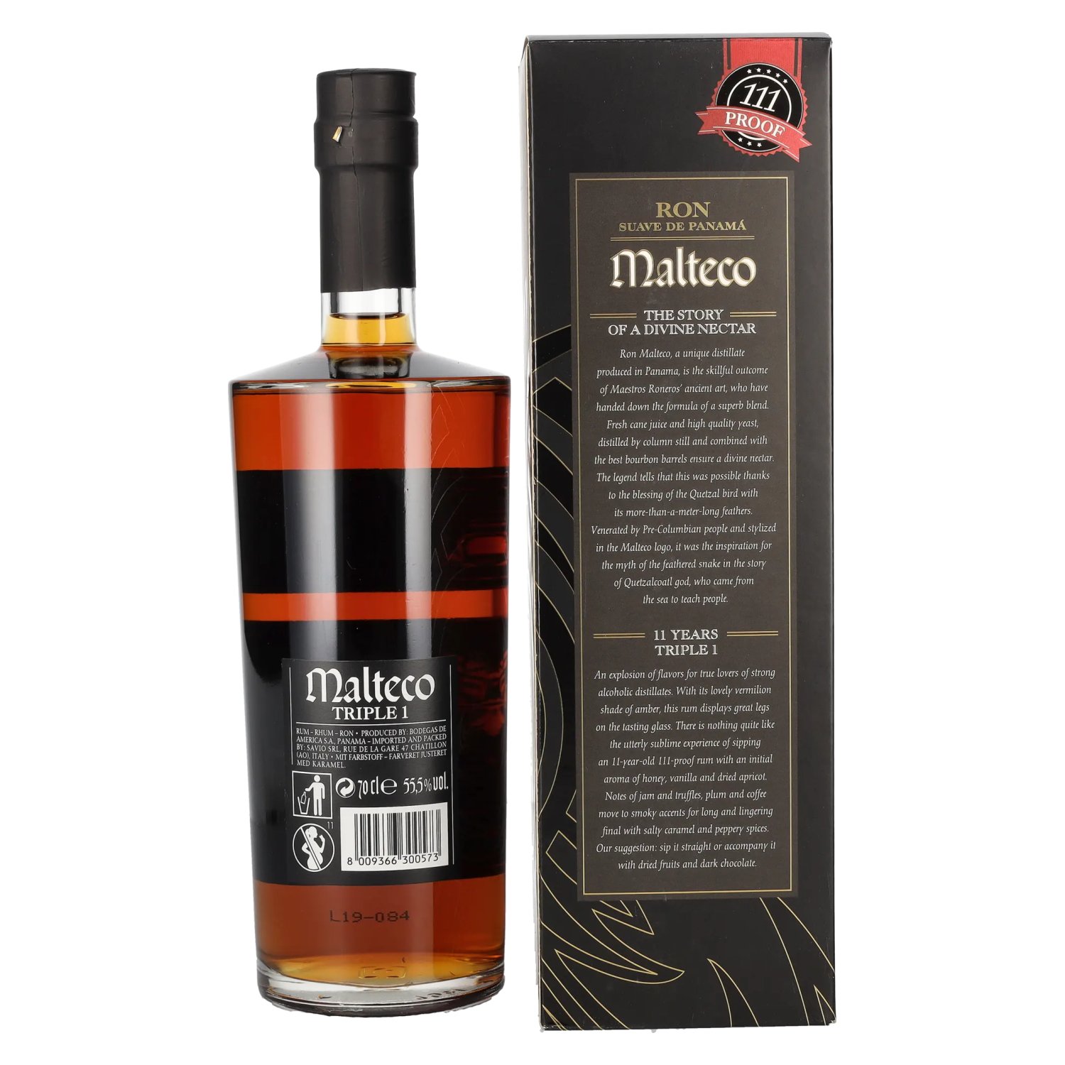 Le Ron Malteco 11 Años TRIPLE 1 est un rhum premium exceptionnel du Panama, embouteillé à un puissant 55,5 % vol. et qui impressionne par son intense maturation et ses arômes complexes. Produit par Bodegas de America S.A., ce rhum est basé sur la dis Note de dégustation: Couleur : ambre profond avec des reflets dorés.
