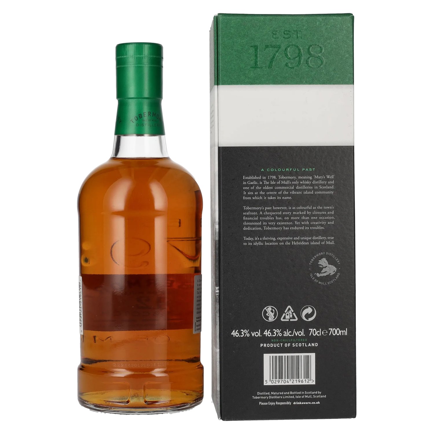 Fondée en 1798, la Tobermory Distillery est l'une des plus anciennes distilleries d'Écosse, située à Tobermory sur l'île de Mull. Depuis sa création, elle a connu des périodes de turbulences avec de nombreux changements de propriétaires et des arrêts Note de dégustation: Couleur : ambre clair.