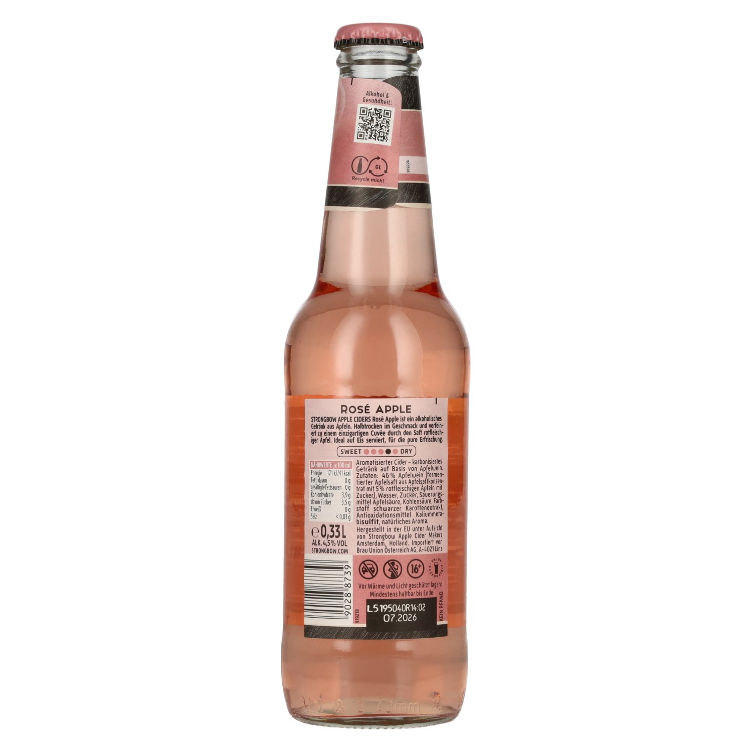 Le Strongbow Cider Rosé Apple est une interprétation moderne du cidre classique de la maison Strongbow. Cette variante combine des pommes sélectionnées avec un soupçon de fruits rouges et se présente comme un cidre rosé fruité au style clair et rafra Note de dégustation: Couleur : Rose tendre, clair et vif.