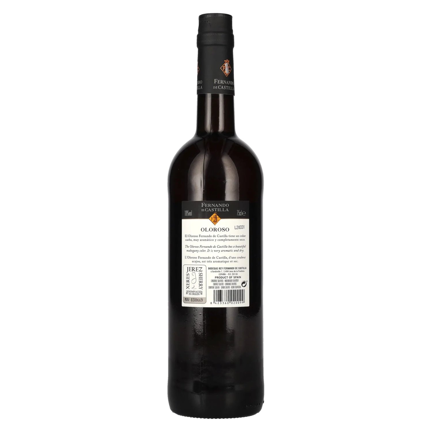 Le Fernando de Castilla Oloroso Classic Dry Sherry à 18 % vol. est un sherry puissant et sec de la célèbre maison Fernando de Castilla à Jerez de la Frontera, le cœur de la région de sherry andalouse. Cet Oloroso se présente dans un style classique - Note de dégustation: Dans le verre, l'Oloroso se présente dans une teinte profonde d'ambre à acajou avec des reflets dorés. Le nez est complexe, avec des notes de noisettes grillées, de dattes séchées, de tabac, de cuir, de cèdre et un soupçon de vanille et d'épices. La