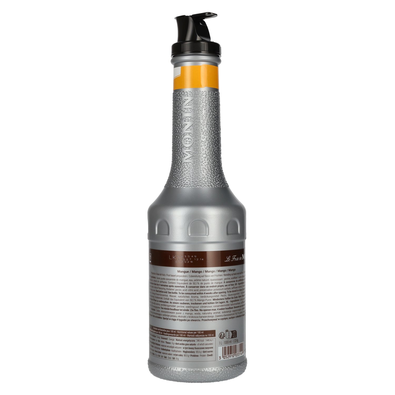 Ingrédients:Zucker, Mango-Puree-Konzentrat, Wasser, natürliches Aroma, Verdickungsmittel: Pectin, Säuerungsmittel: Citronensäure, Konservierungsstoff: Kaliumsorbat, Distelextrakt, enthält das Equivalent von 50,1% Mango-Puree