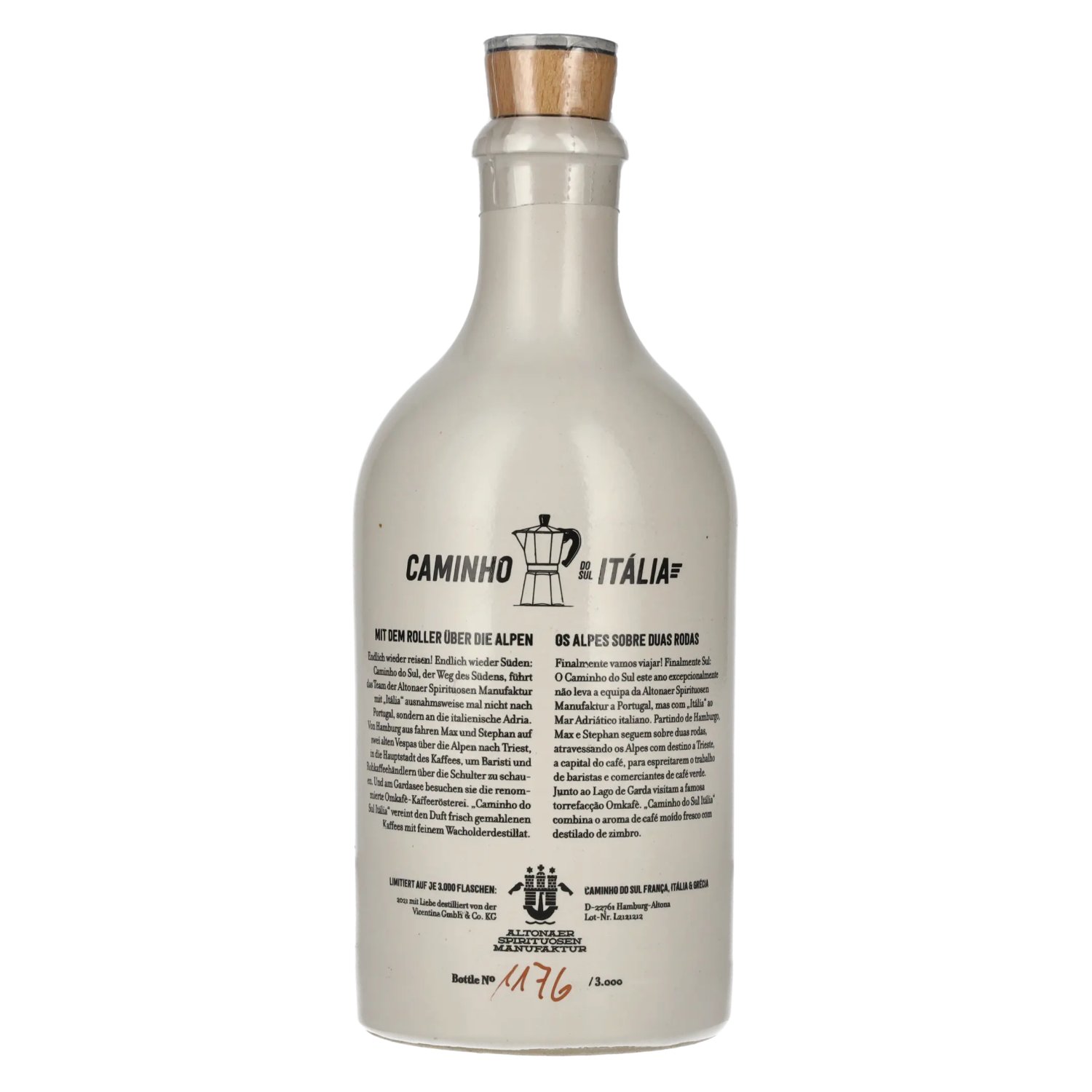 Caminho do Sul Itália entraîne l'équipe de la manufacture de spiritueux d'Altona dans un voyage aromatique le long de l'Adriatique italienne. Max et Stephan partent de Hambourg sur deux vieilles Vespas et traversent les Alpes jusqu'à Trieste, la capi Note de dégustation: Couleur : claire.