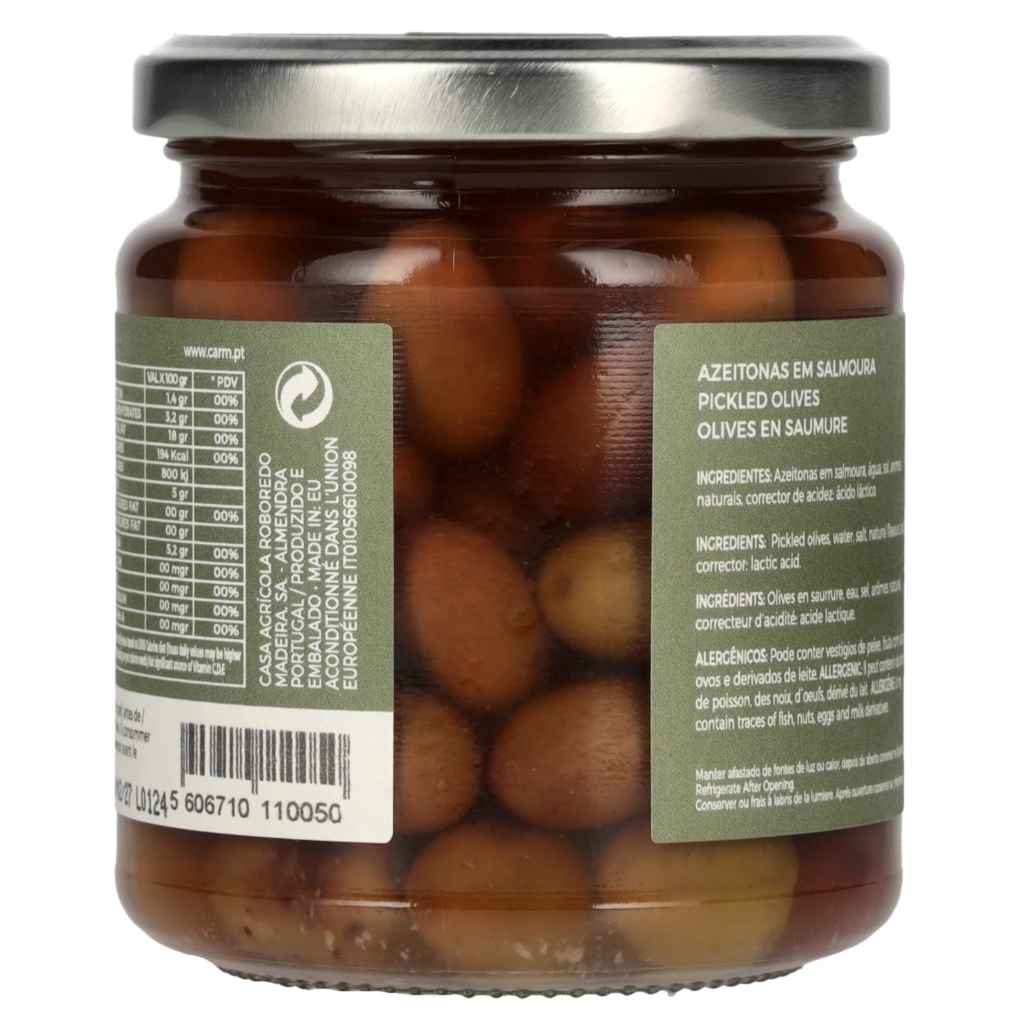 Marque: Ingrédients:Ingredients: Pickled olives, water, salt, natural flavours, acidity corrector, lactic acid.