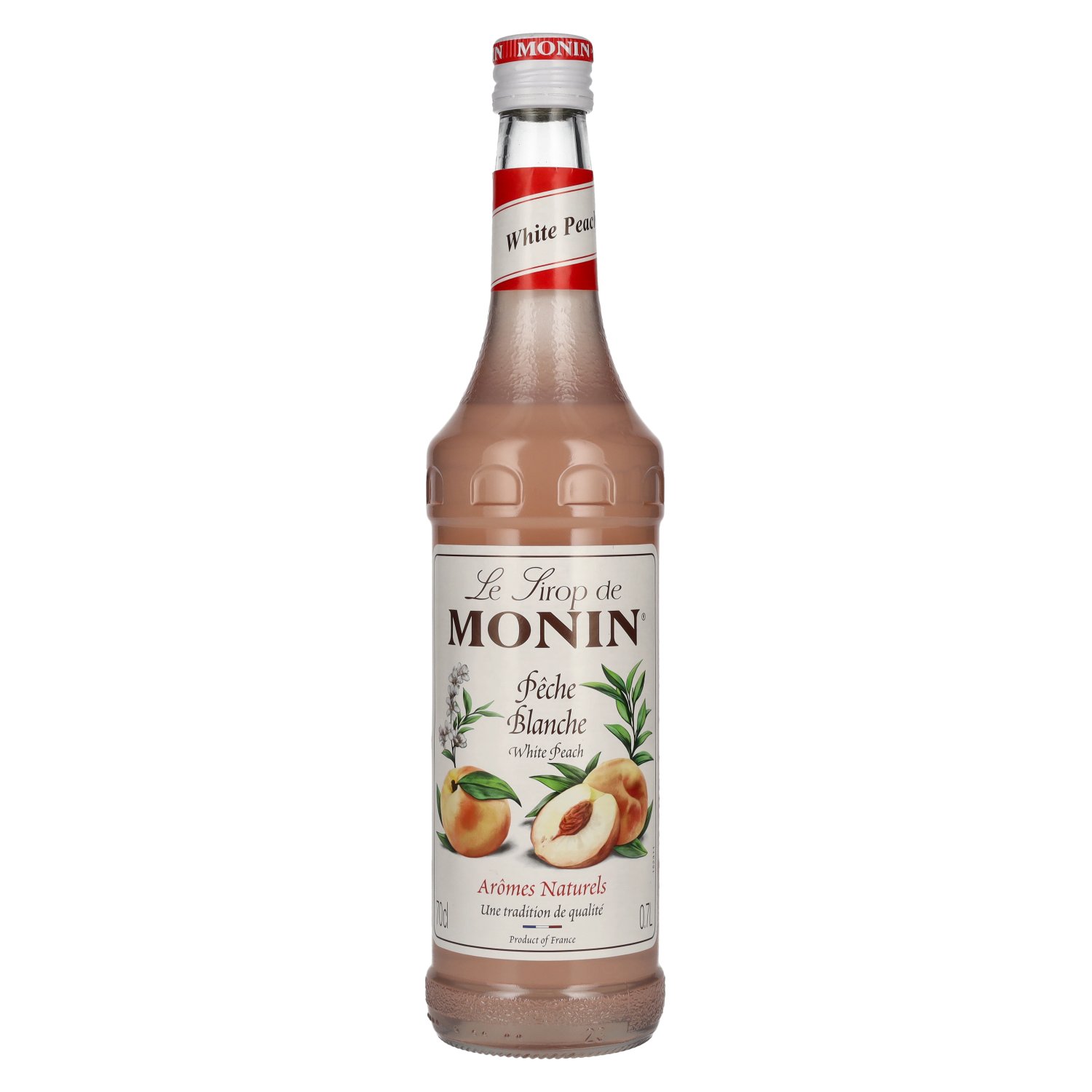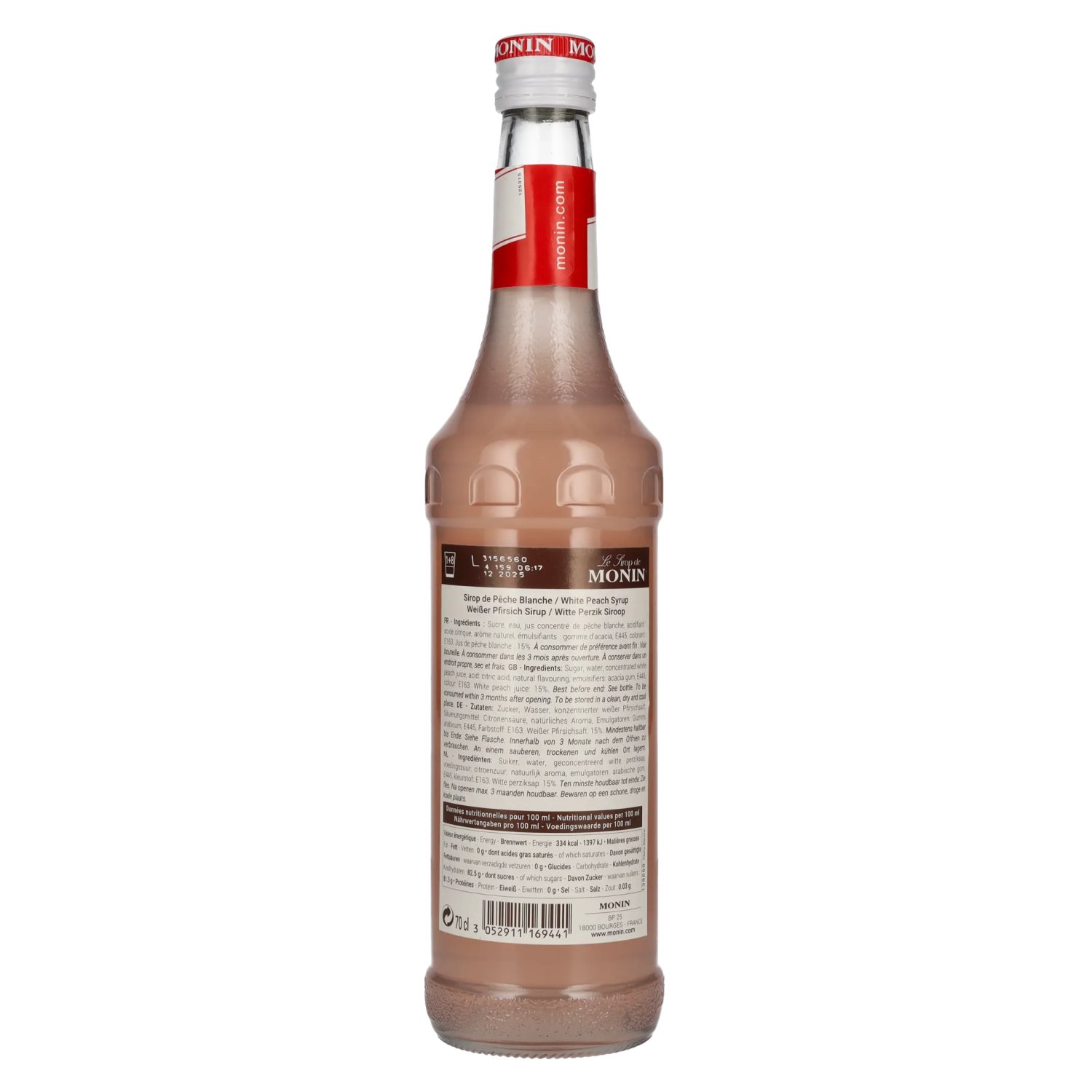 Ingrédients:Zucker, Wasser, konzentrierter weißer Pfirsichsaft, Säuerungsmittel: Citronensäure, natürliches Aroma, Emulgatoren: Gummi arabicum, E445, Farbstoff: E163, weißer Pfirsichsaft: 15%