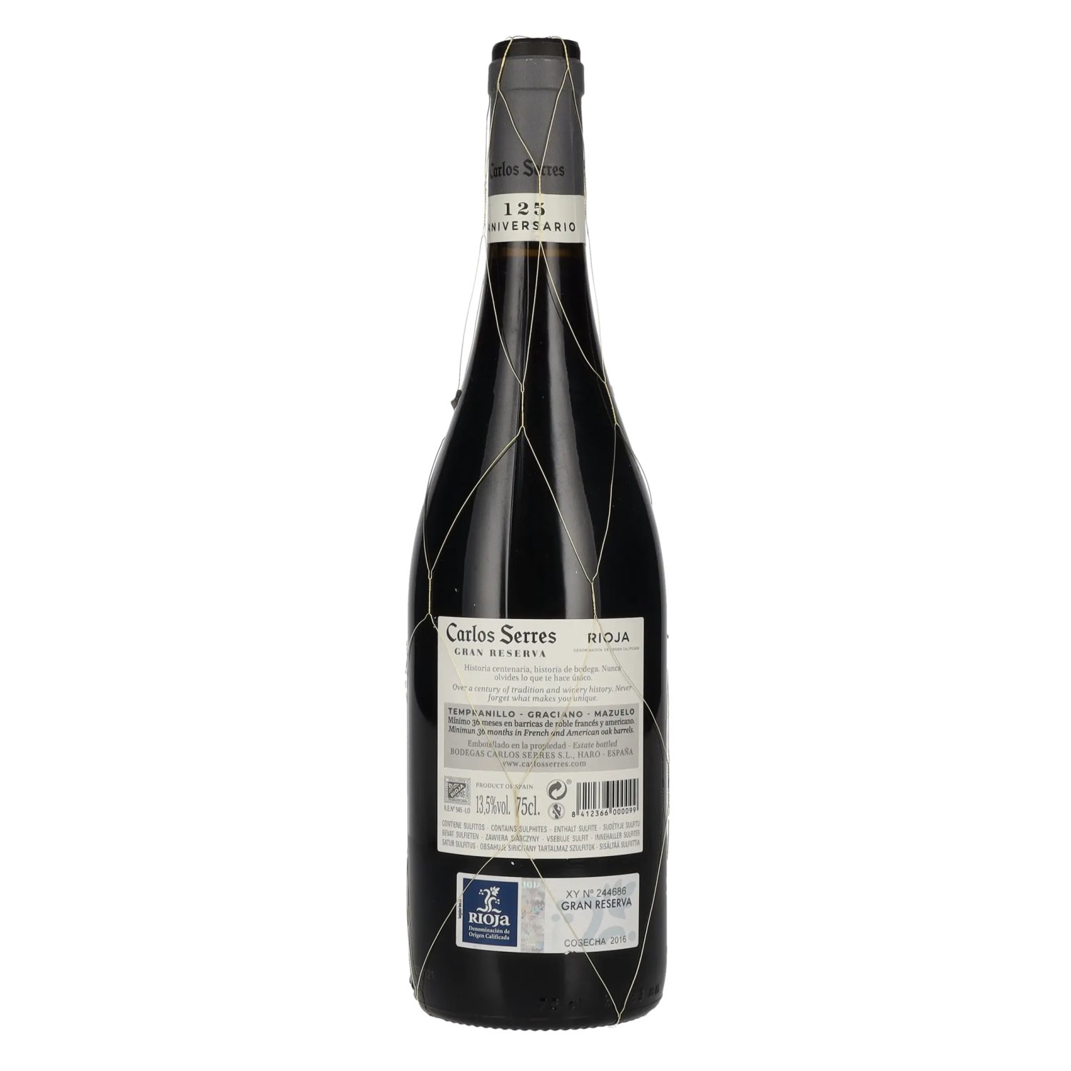 Le vin raconte des histoires, et celle de Carlos Serres en est une qui traverse les époques. Ce conseiller en vin français originaire de Bordeaux, dont la patrie a été ravagée par le phylloxéra, a découvert à Haro, au cœur de la Rioja, le terroir par Note de dégustation: Rouge vif avec des reflets grenat. Au nez, des arômes complexes de fruits noirs mûrs, accompagnés de vanille, d'épices à la cannelle et d'un profond noyau minéral. La bouche est veloutée, harmonieuse et élégante, avec une finale fraîche et persistant