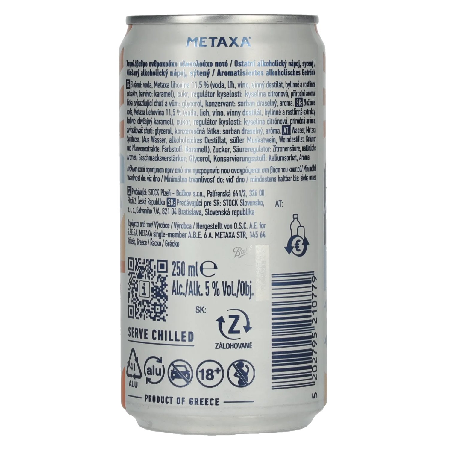 Ingrédients:Wasser, Metaxa Spirituose (aus Wasser, alkoholisches Destillat, süßer Muskatwein, Weindestillat, Kräuter und Pflanzenextrakte, Farbstoff: Karamell), Zucker, Säureregulator: Zitronensäure, natürliche Aromen, Geschmacksverstärken, Glycerol, Konservierungsstoff: Kaliumsorbat, Aroma