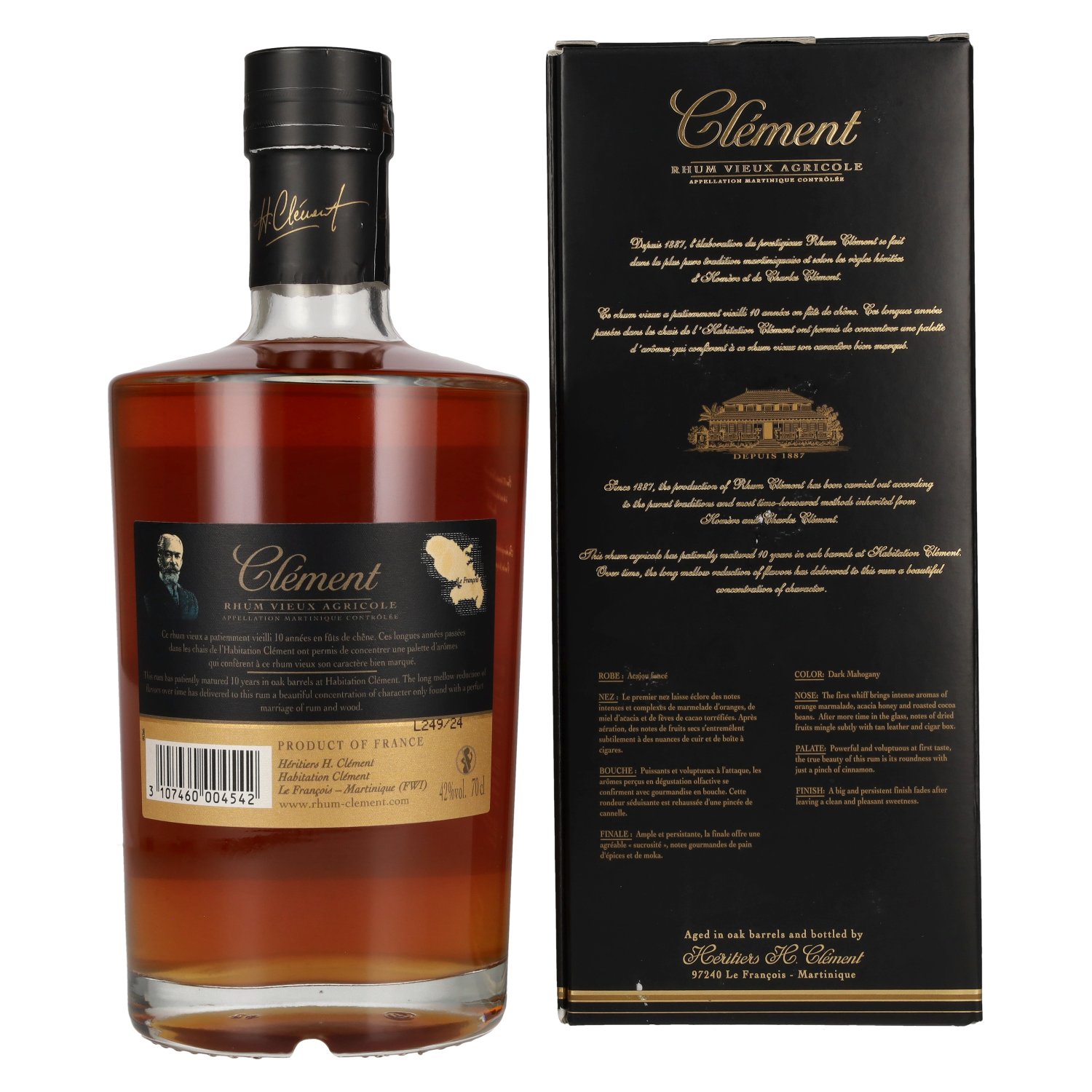 De Clément Rhum Vieux Agricole 10 Ans is een uitzonderlijke, gerijpte rhum agricole uit Martinique, die meer dan tien jaar in de Caribische zon rijpt in zorgvuldig geselecteerde eikenhouten vaten. Gemaakt van vers suikerrietsap in plaats van melasse, Proefnotitie: Kleur: Diep amber met gouden reflecties.