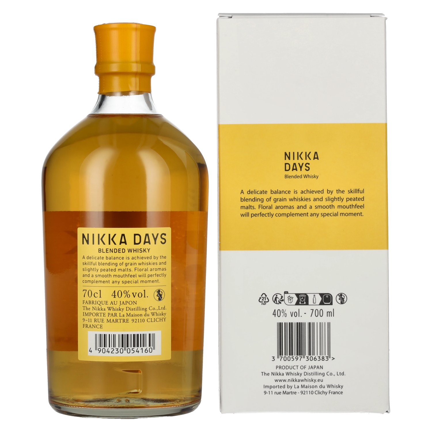 De Nikka DAYS Smooth & Delicate Blended Whisky is een eerbetoon aan de kunst van het Japanse whisky maken. Met een alcoholpercentage van 40% vol. en een flesgrootte van 0,7 liter biedt deze whisky een toegankelijke maar verfijnde smaakervaring. De st Proefnotitie: Kleur: Licht goud met heldere, glinsterende reflecties.
