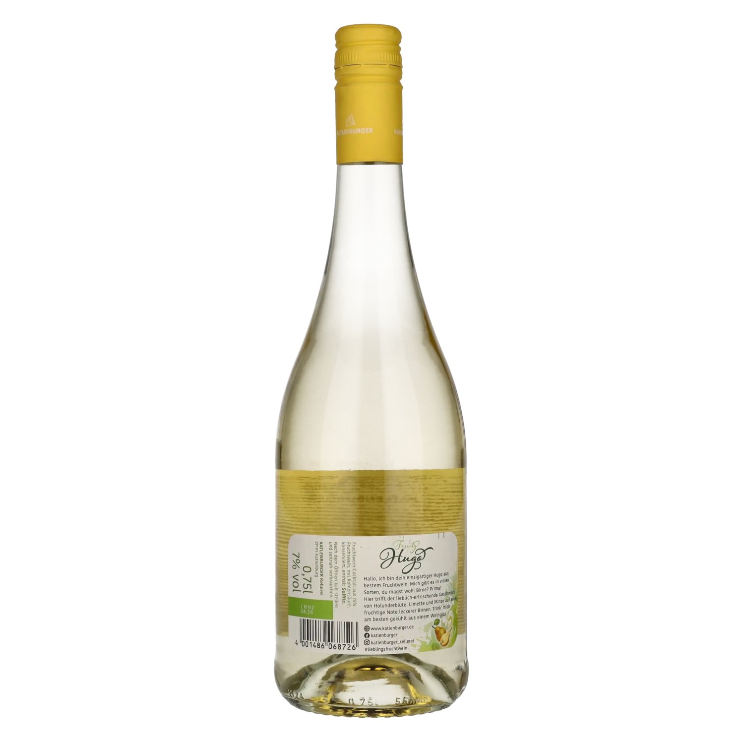 Katlenburger Fruity Hugo Pear 7% Vol. 0.75 l is een verfrissende, mousserende fruitwijn die de bekende combinatie van vlierbloesem en munt combineert met de milde zoetheid van rijpe peren. Geproduceerd door de gerenommeerde Katlenburger Fruchtweinkel Proefnotitie: In het glas heeft de Katlenburg Fruity Hugo Pear een lichte, gouden kleur met fijne, levendige belletjes. De geur verleidt met de milde, fruitige zoetheid van peren, vergezeld van een bloemig vleugje vlierbloesem. Een delicaat vleugje munt rondt het