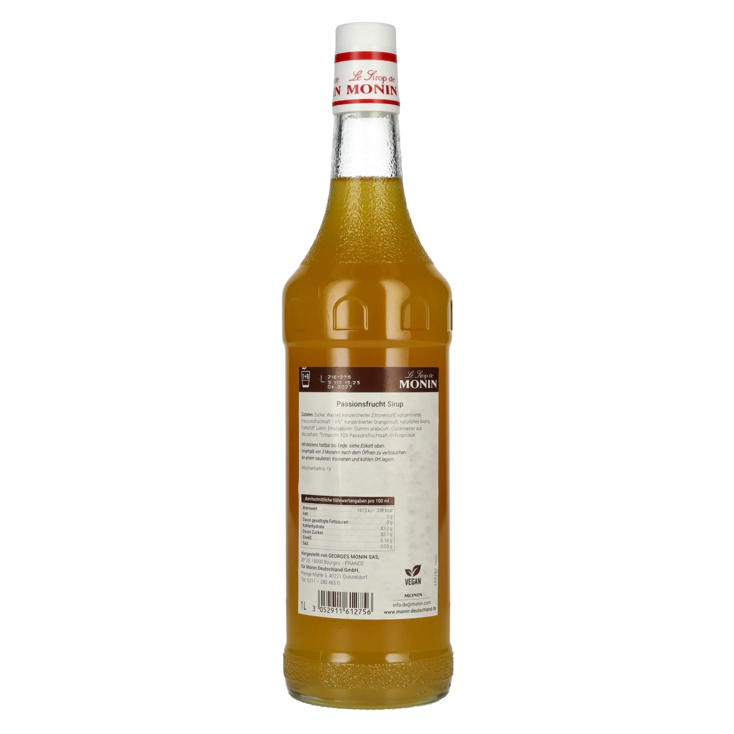Ingrediënten:Zucker, Wasser, konzentrierter Zitronensaft, konzentrierter Passionsfruchtsaft 1.6%*, konzentrierter Orangensaft, natürliches Aroma, Farbstoff: Lutein, Emulgatoren: Gummi arabicum, Glycerinester aus Wurzelharz. *Entspricht 10% Passionsfruchtsaft im Endprodukt.