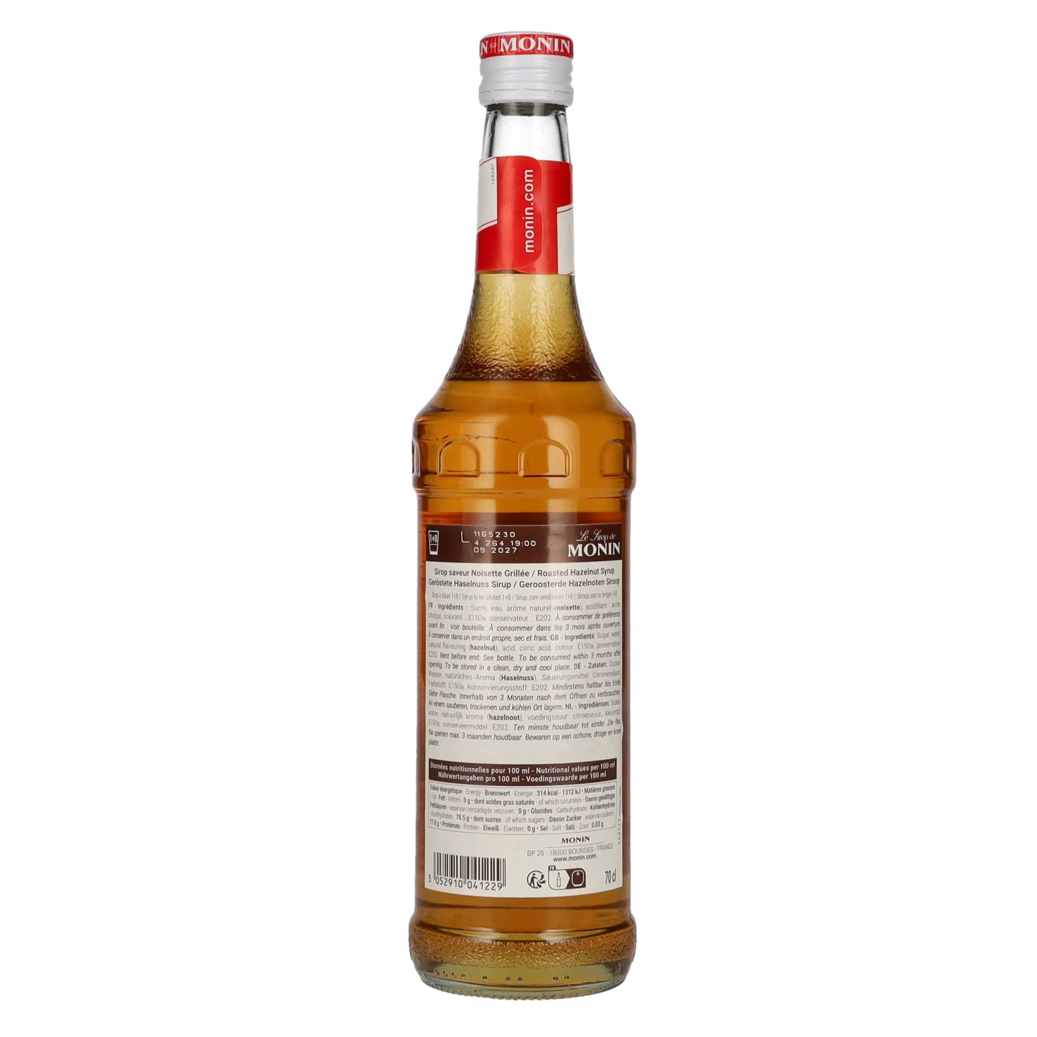 Ingrediënten:Zucker, Wasser, natürliches Aroma (Haselnuss), Säuerungsmittel: Citronensäure, Farbstoff: E150a, Konservierungsstoff: E202