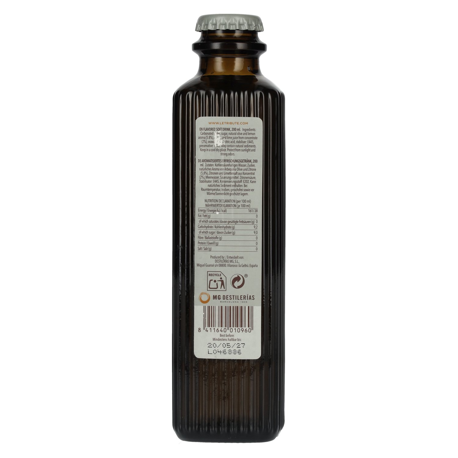 Merk: Ingrediënten:Kohlensäurehaltiges Wasser, Zucker, natürliches Aroma von Arbequina Olive und Zitrone (5,8%), Zitronen- und Limettensaft aus Konzentrat (2%), Meerwasser, Säuerungsmittel: Zitronensäure, Stabilisatoren: E445, Konservierungmittel: E202