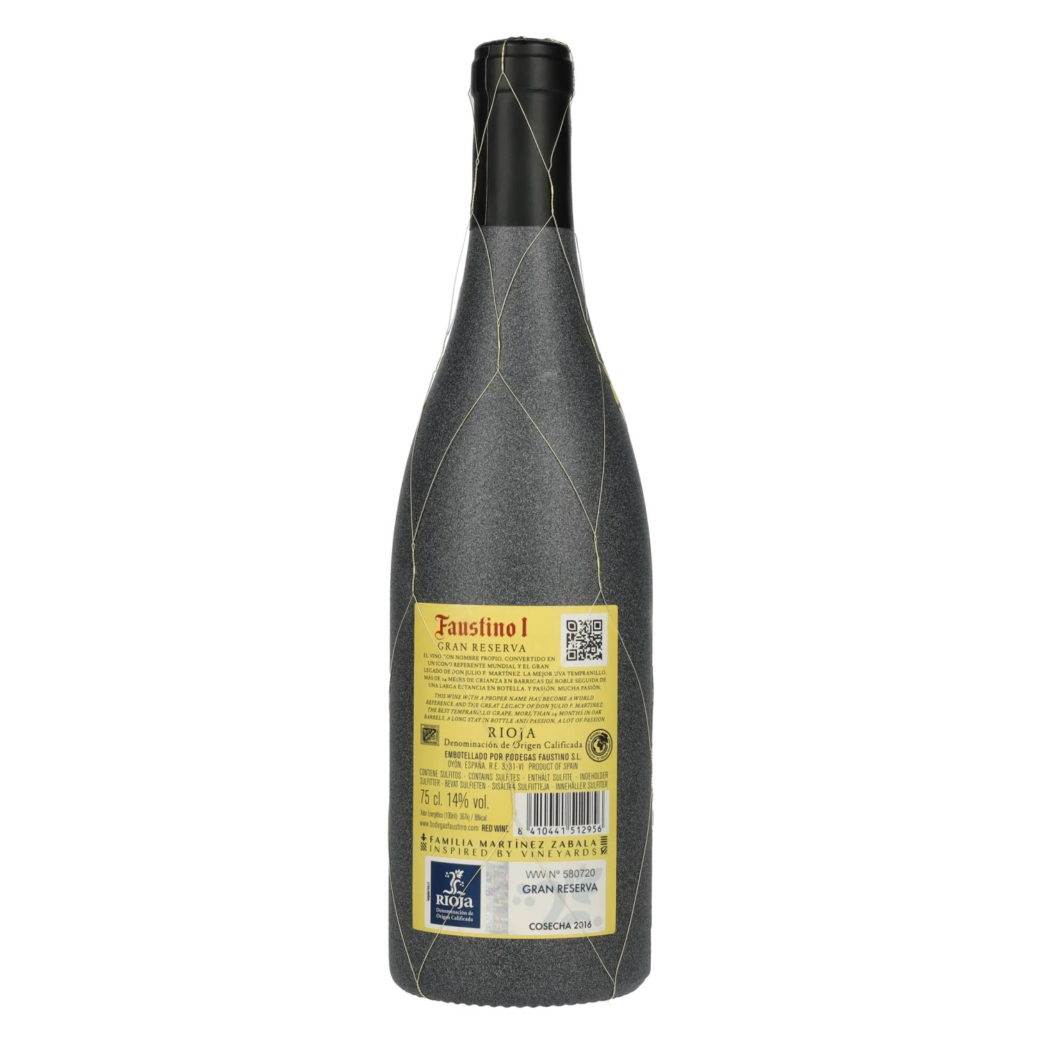 De Faustino I Gran Reserva 2016 met 14% vol. in een fles van 0,75 liter is een van de bekendste en meest prestigieuze Rioja Gran Reservas in Spanje en is afkomstig van het traditionele Bodegas Faustino landgoed in La Rioja. Deze lang gerijpte wijn va Proefnotitie: De kleur in het glas is diep robijnrood met granaatkleurige reflecties. De neus onthult tonen van rijpe donkere bessen, gedroogd fruit en delicate geroosterde smaken, vergezeld van vanille, tabak, kruiden en een vleugje leer. In de mond is de wijn vo